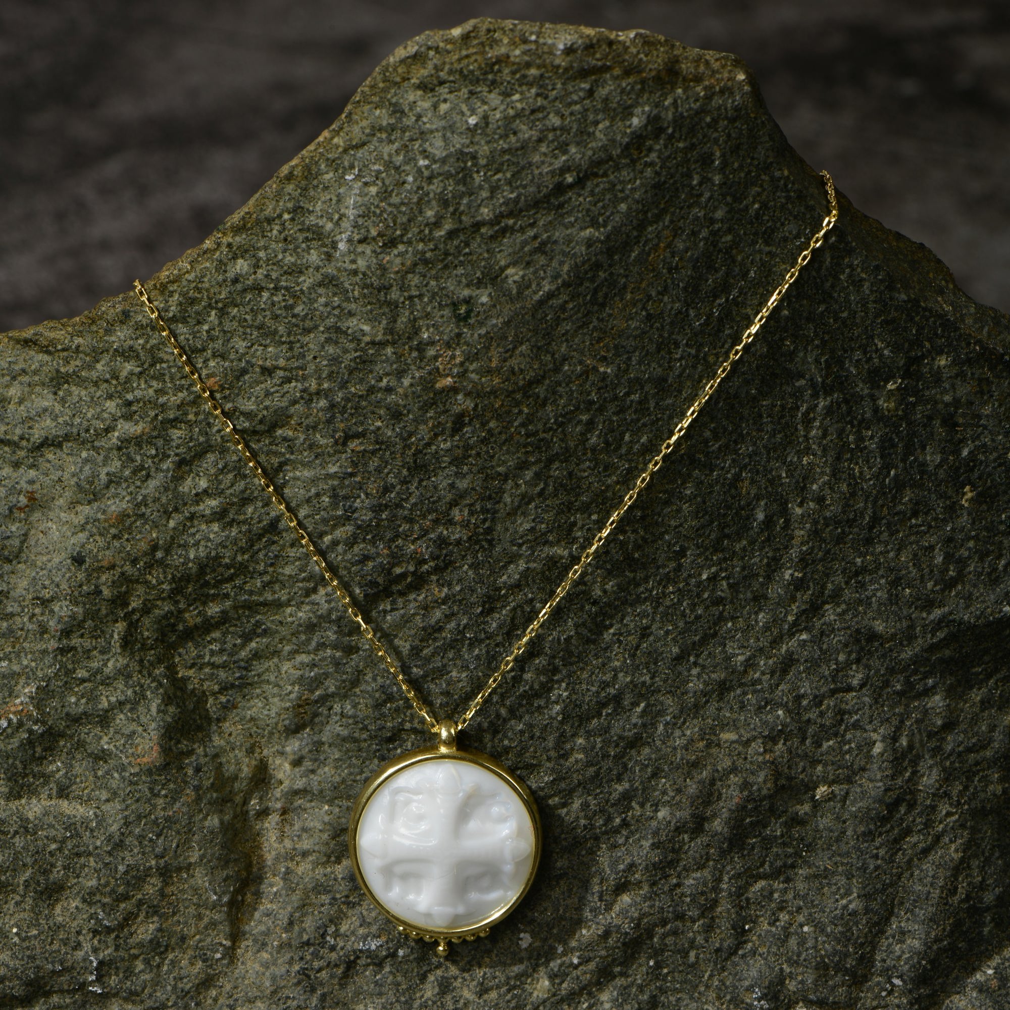 Intaglio Glass Ancient Greek Cross Necklace is unique piece of Augusta Antonina's Antique Collection. Glass Carved Silver Cross Necklace has beautiful craftmanship and in the details you can see ICXC NIKA words which means "Jesus Christ Conquers." This Byzantine Orthodox Cross Necklace is made from 18K Gold Plated 925 Solid Sterling Silver and glass. Antique Glass Jewelry is always a great gift for yourself or for your loved one who is really curious about history, mythology and design that has story behind it.