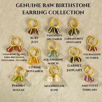 Designed as raw stone drop earrings, this collection blends organic texture with refined simplicity. The unpolished gemstones preserve their natural shape and surface, which many believe enhances their energetic and healing properties. Lightweight and versatile, these birthstone huggie hoops are perfect for everyday wear or meaningful gifting.
