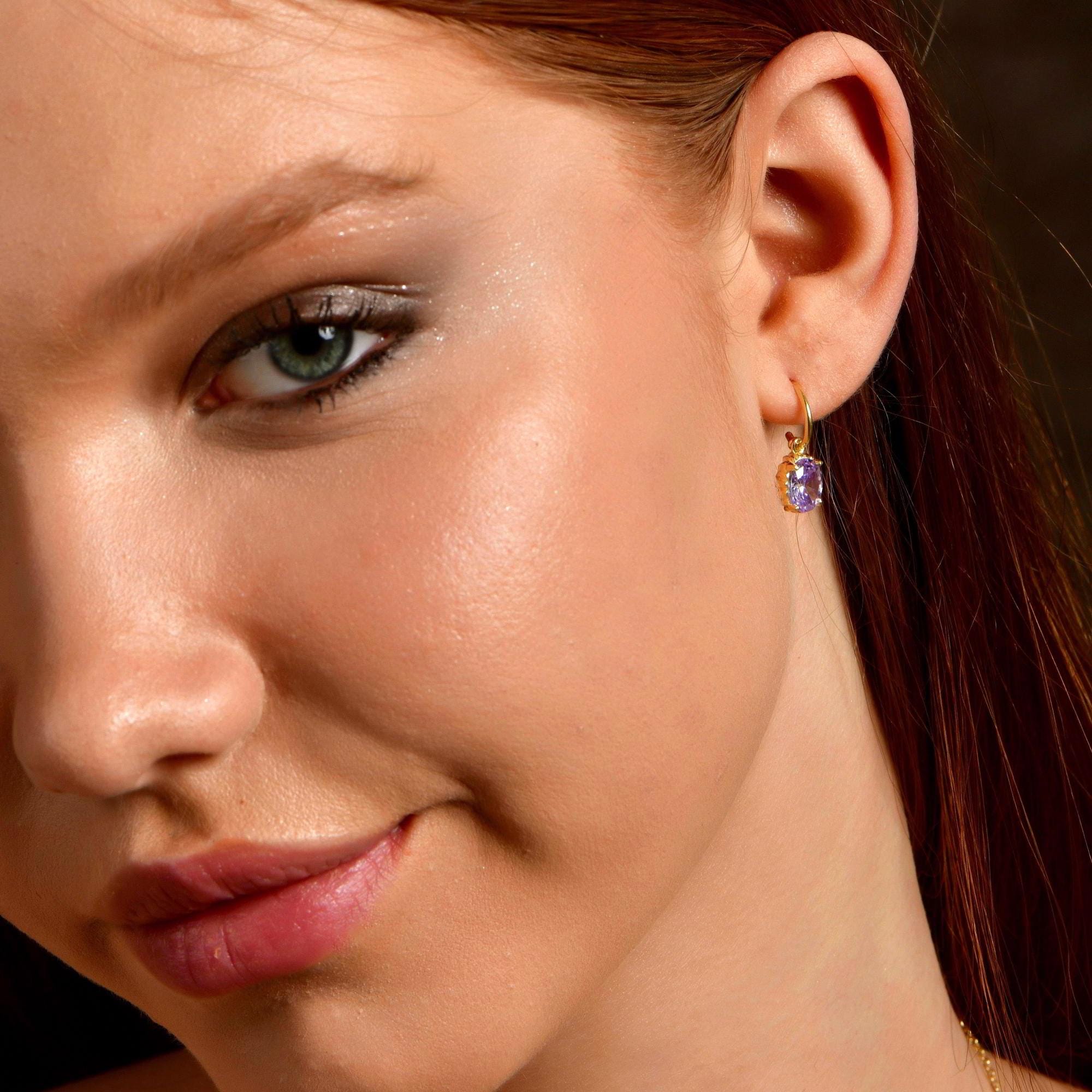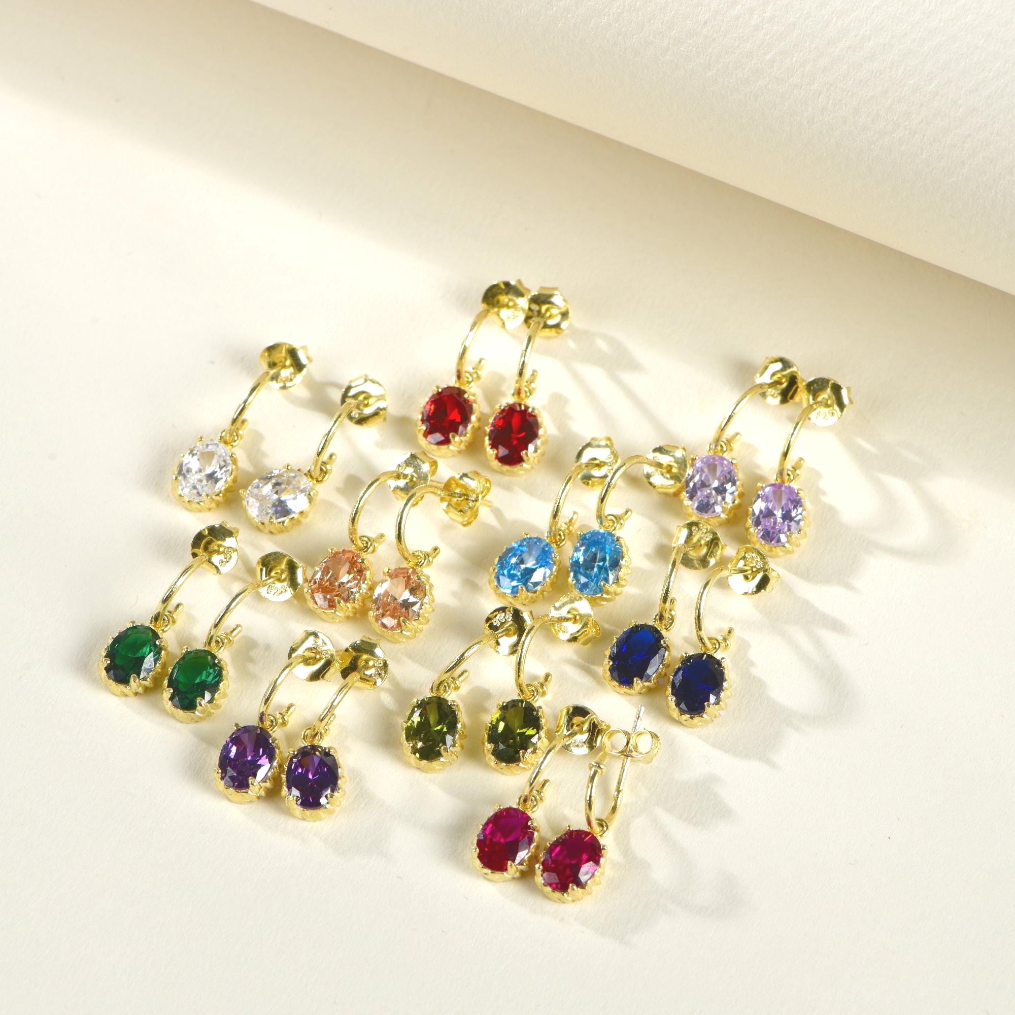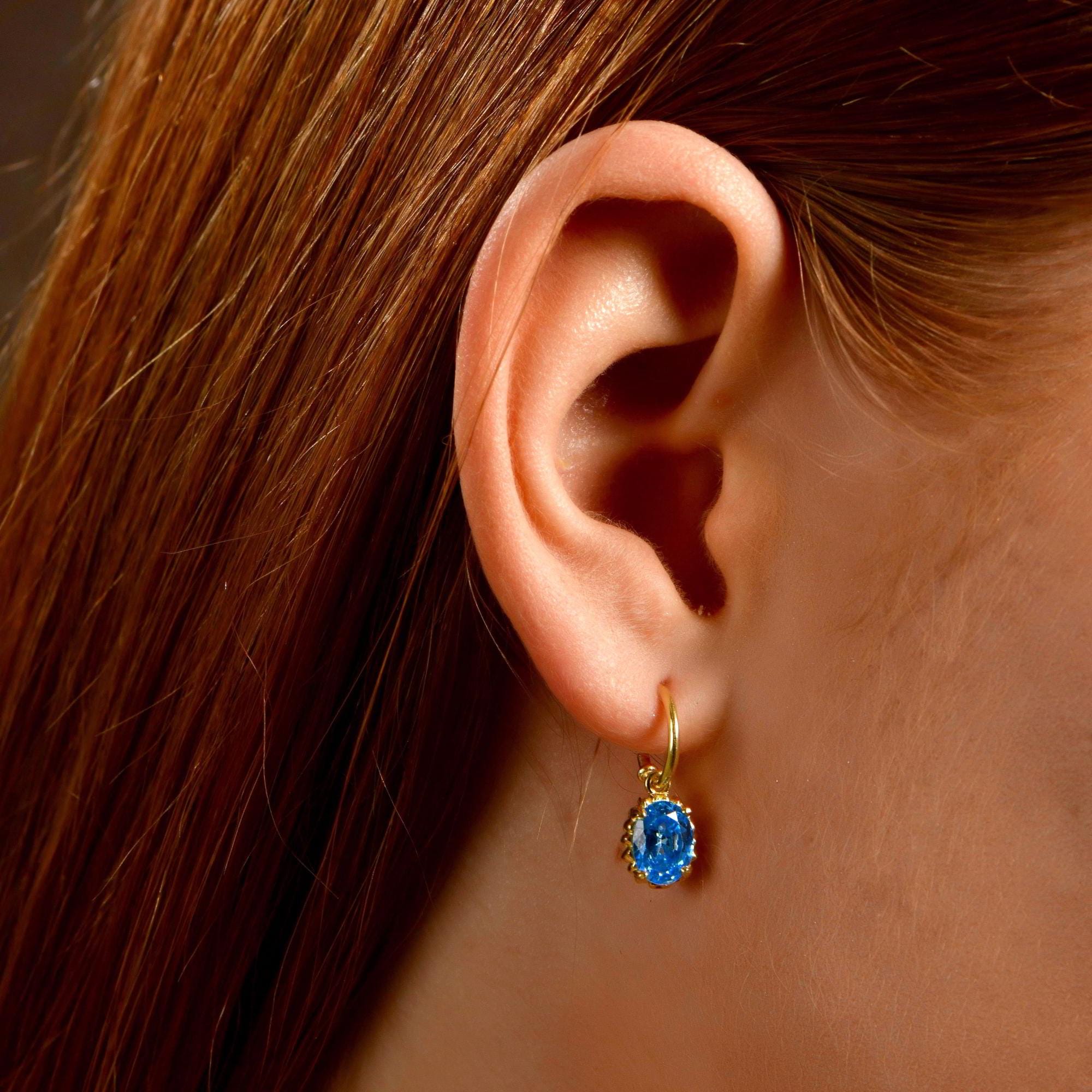 Silver Teardrop Birthstone Hoop Earrings, 24K Gold Plated Gemstone Huggie Hoops, Oval Cut CZ Drop Earrings, Custom Jewelry Gift For Women