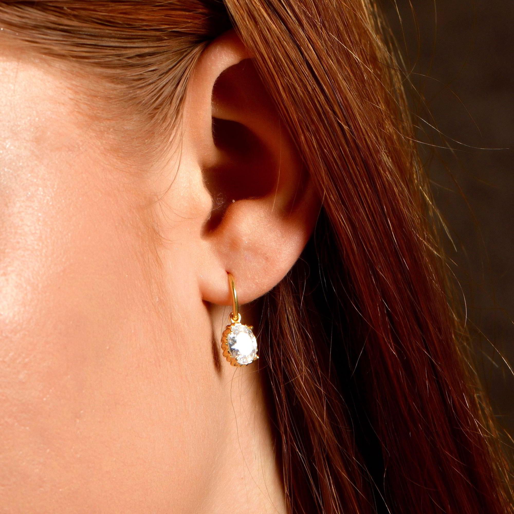 Silver Teardrop Diamond Hoop Earrings, 24K Gold Plated Birthstone Huggie Hoops, Oval Cut CZ Diamond Drop Earrings, Jewelry Gift For Women
