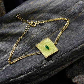 Silver Emerald Evil Eye Bracelet is adorable piece of Augusta Antonina's Special Collection. Handcrafted and designed with love and care by the finest artists. This gorgeous Emerald Evil Eye Sunburst Bracelet is made from 18K Gold Plated High Quality 925 Sterling Silver, delicate duo chain, Green Enamel and High Quality Emerald Cubic Zirconia Stones. The combination of sunburst figure and eye shape Emerald CZ Stone creates real classy look with the lovely details. Dainty Enameled Rectangle Boho Bracelet will be perfect match for your outfit and will give you stylish look.