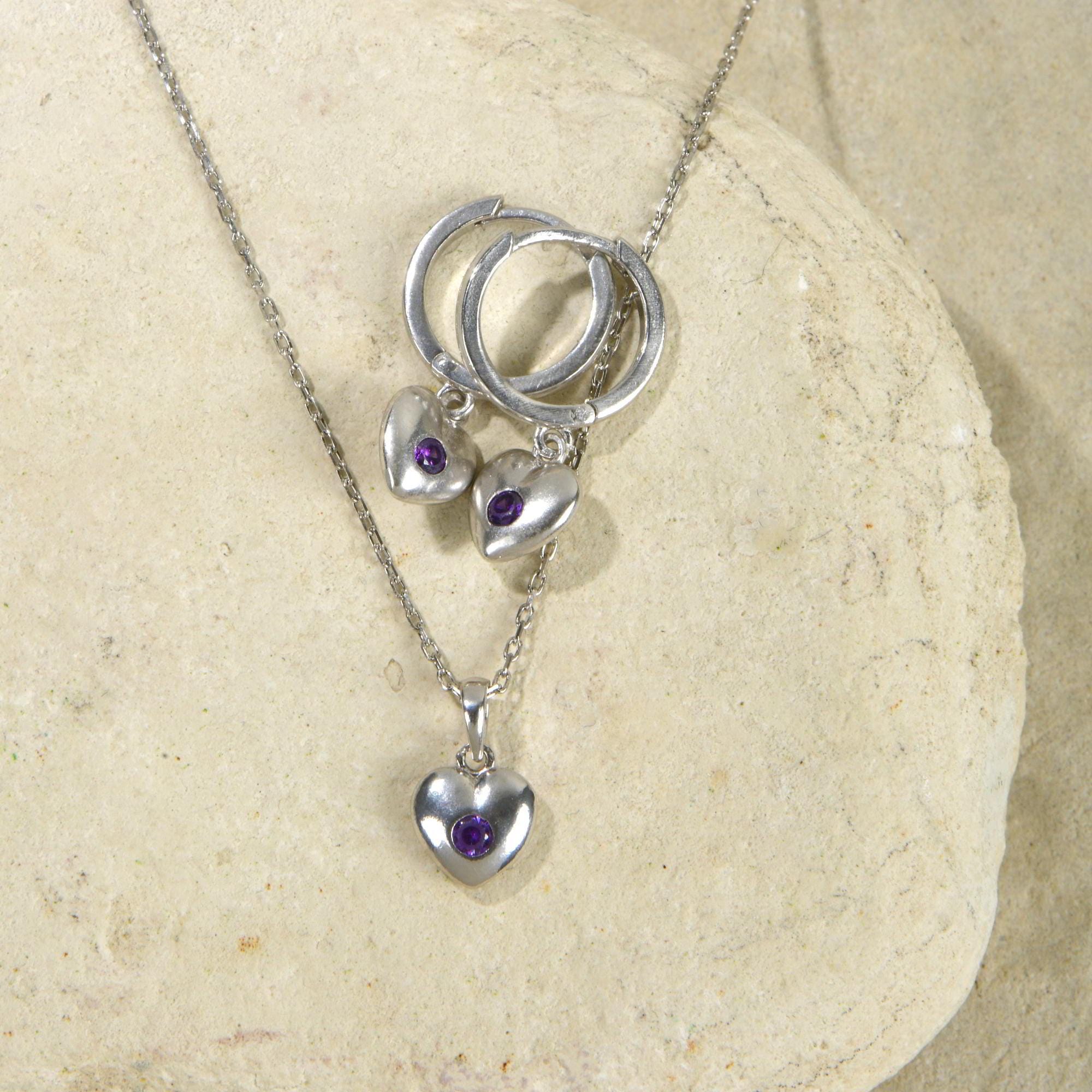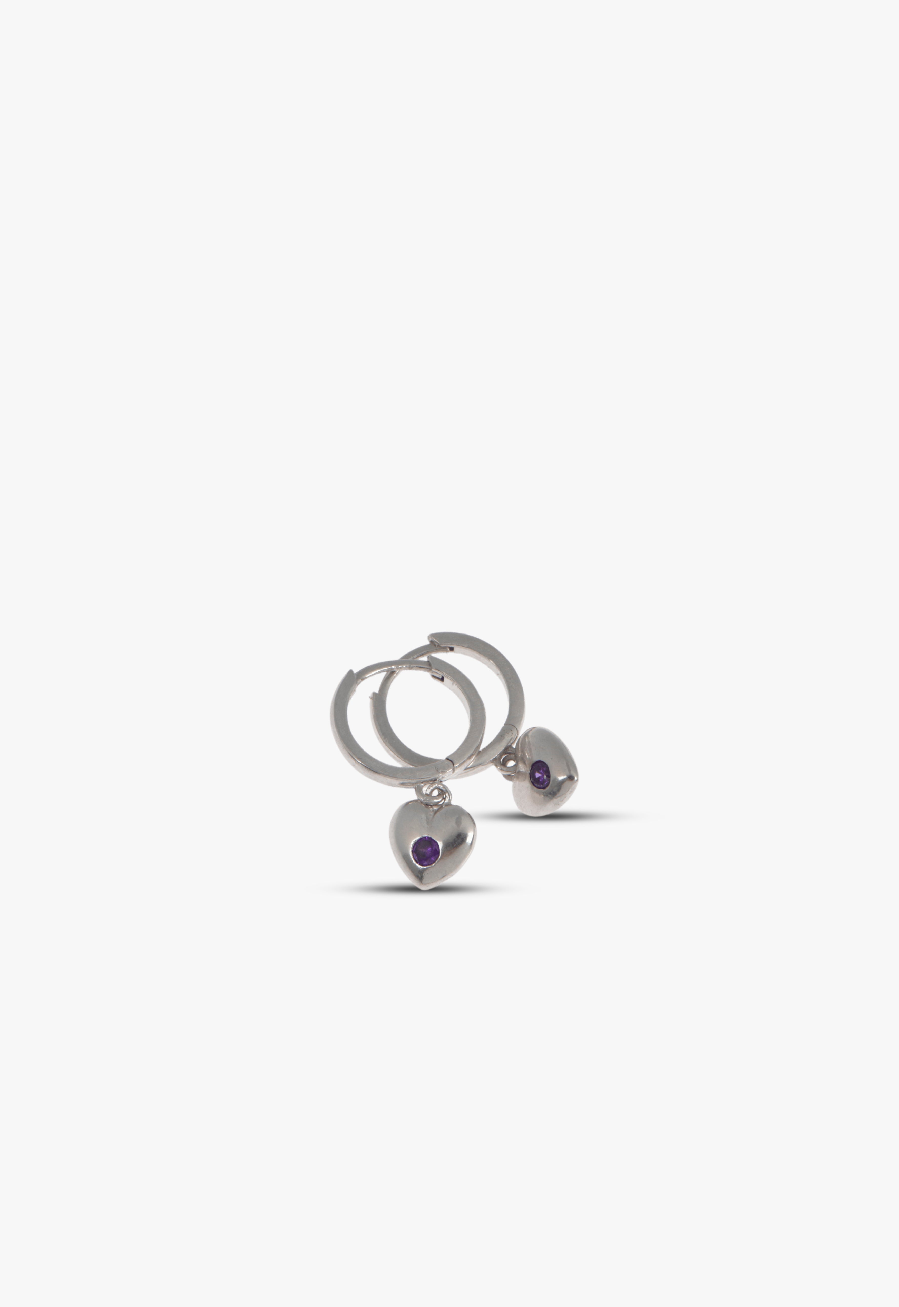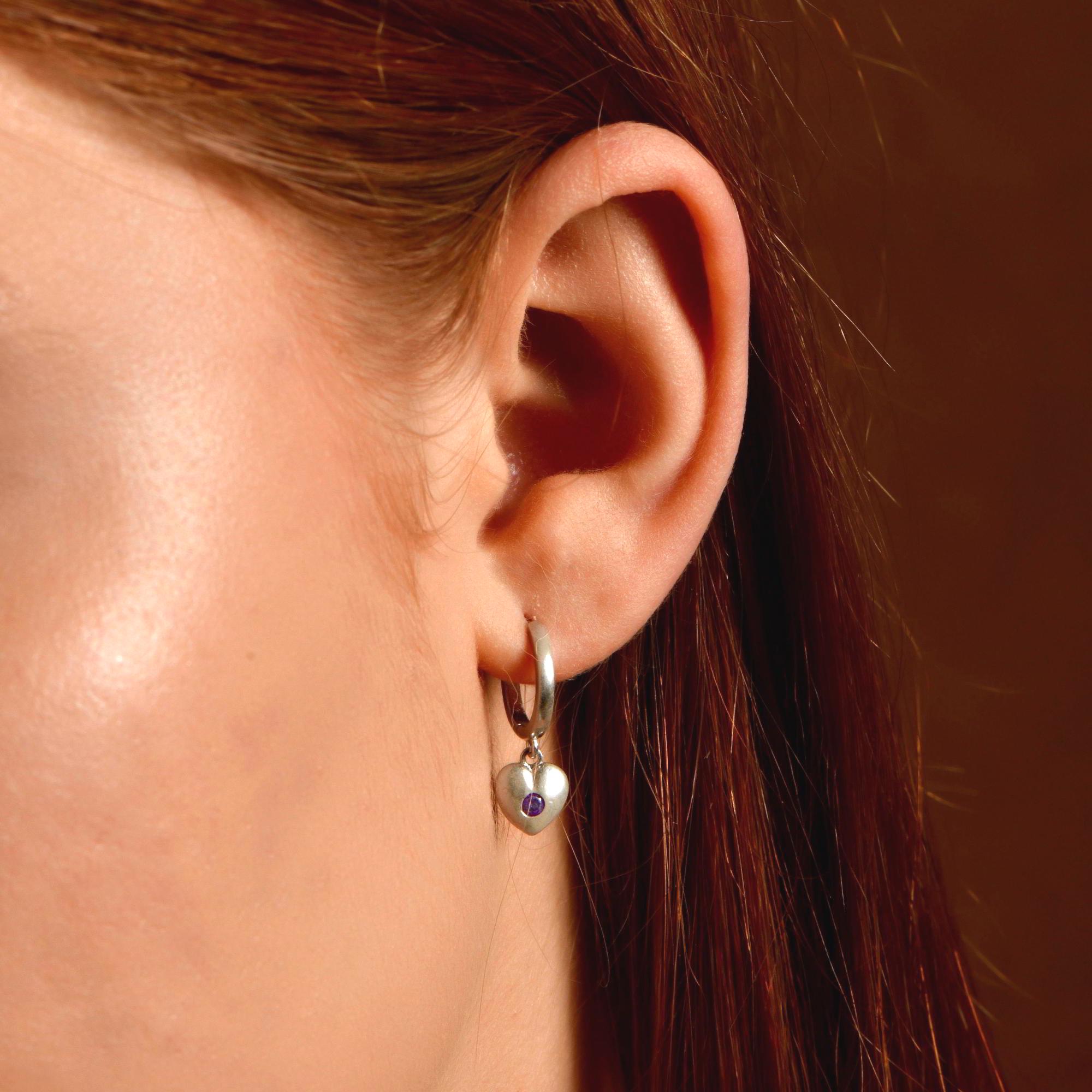Tiny Silver Puff Heart Huggie Earrings, Minimalist Charm Heart Huggie Hoops, Amethyst Birthstone Heart Drop Hoop Earrings, Cute Gift For Her