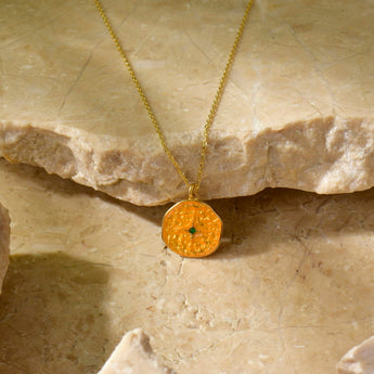 Silver Emerald Star Necklace in 18K Gold, Orange Enameled Coin Pendant, Round Shape Medallion Pendant, Stylish Jewelry, Boho Gift For Women