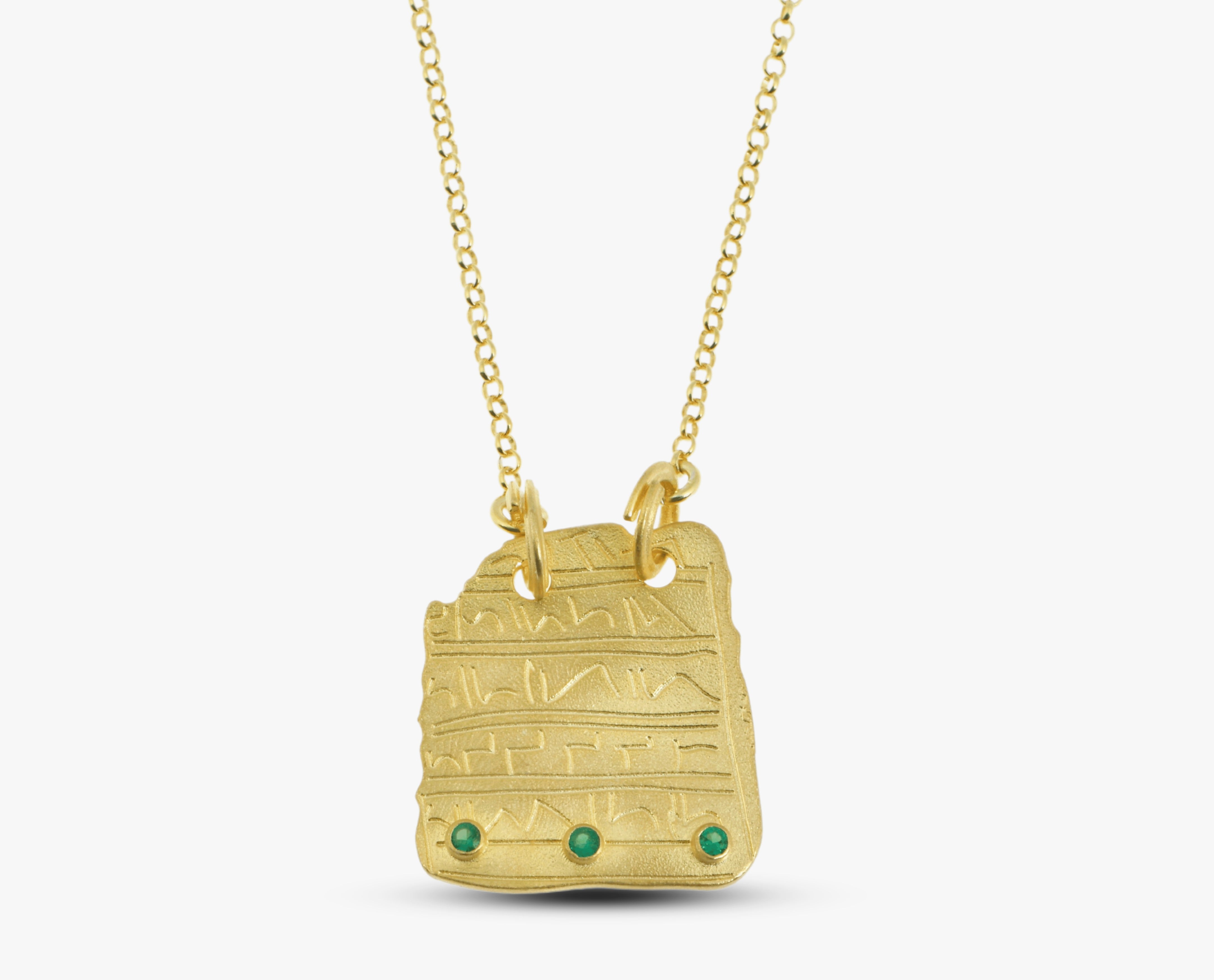 Ancient Engraved Tablet Necklace is unique piece of Augusta Antonina's Antique Collection. 18K Gold Plated Cuneiform Inscription Necklace made based on the exact original figure and has beautiful craftmanship. We are extremely passionate about modernising ancient symbols of our historical traces and making jewelry from these ideas. This Ancient Mesopotamian Necklace is made from 18K Gold Plated 925 Solid Sterling Silver and 3 Emerald Cubic Zirconia Stones. Our gorgeous design will attract you with every detail. Antique Jewelry is always a great gift for yourself or for your loved ones but especially who is really curious about Assyrian, Sumerian, Mesopotamian and Egyptian History.