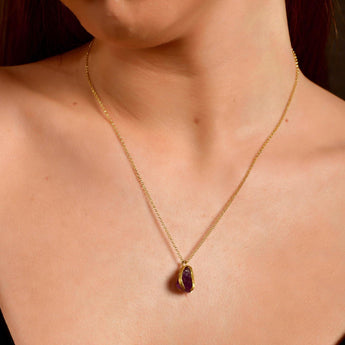 This minimalist Amethyst February birthstone necklace is designed for everyday wear, yet holds deep spiritual significance. Each unpolished Amethyst retains its organic texture, believed to hold more intense healing properties and energy vibrations than cut stones. Known as a calming and protective crystal, Amethyst is said to support peace, mental clarity, and spiritual growth, making it a meaningful piece for grounding and reflection.