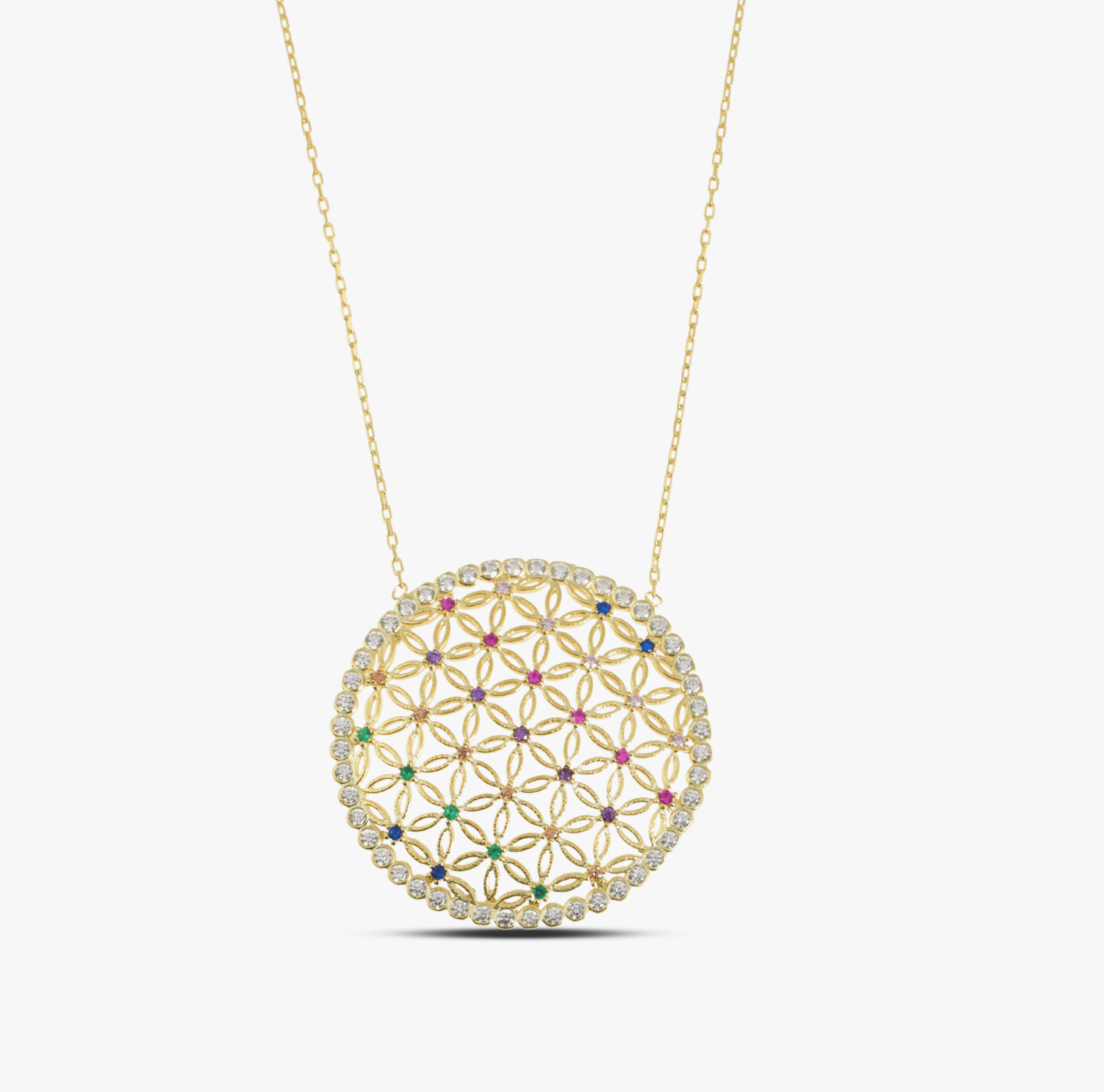 This magical necklace is unique piece of our necklace collection and has different perspective on this kind. Flower of Life Necklace is designed and handcrafted by Augusta Antonina Fine Jewelry with love and care. Flower of Life is one of the most extraordinary, captivating and well known geometric symbols within the magical world of Sacred Geometry. This fascinating symbol represents the cycle of life. There is a belief that within this symbol, holds the most meaningful and sacred patterns of our universe as a whole. This fascinating piece made from 14K Gold Plated Sterling Silver and high quality colorful cubic zirconia stones with adjustable cable chain. Flower of Life Necklace brings spiritual, characteristic and elegant look for you and your loved ones.