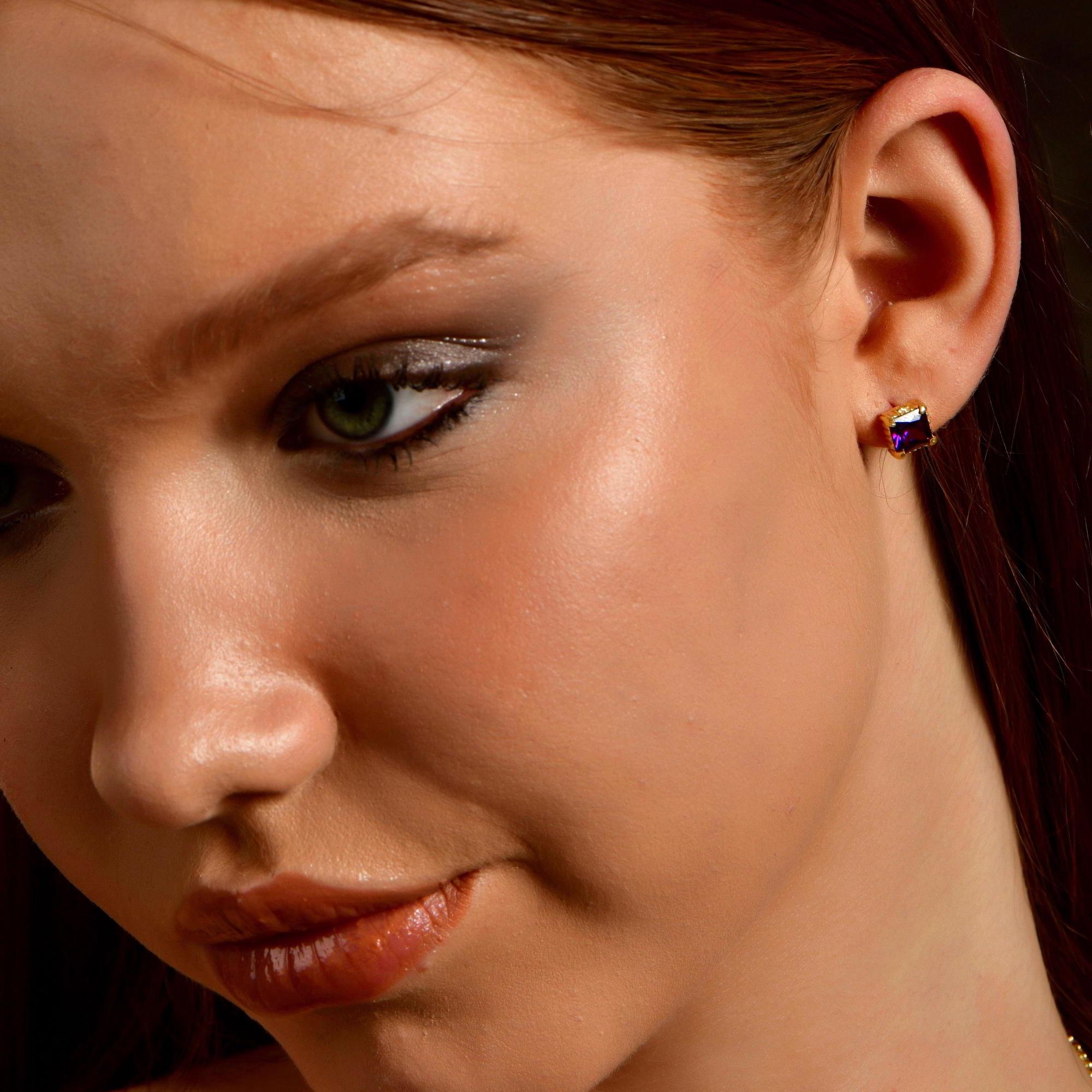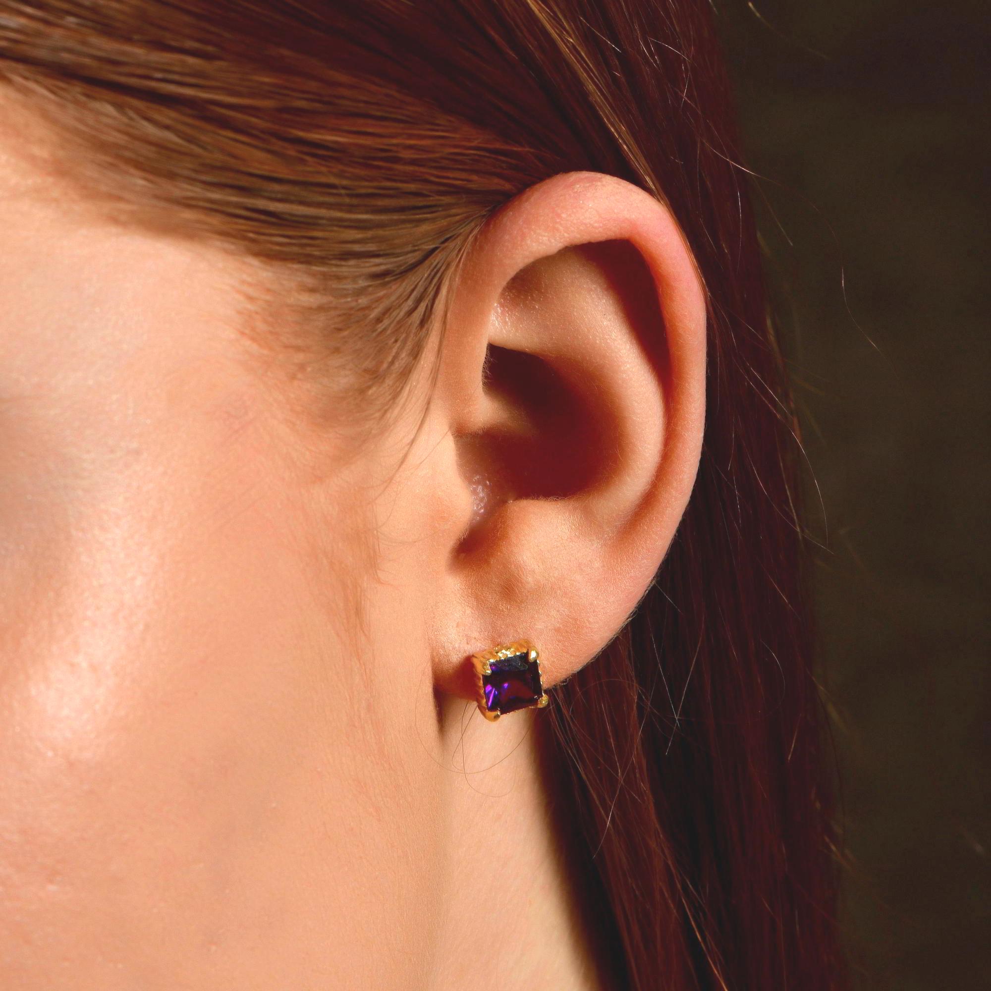 Minimalist Silver Amethyst Stud Earrings, Gold Plated February Birthstone Studs, Princess Cut Purple Gemstone Earrings, Jewelry For Women