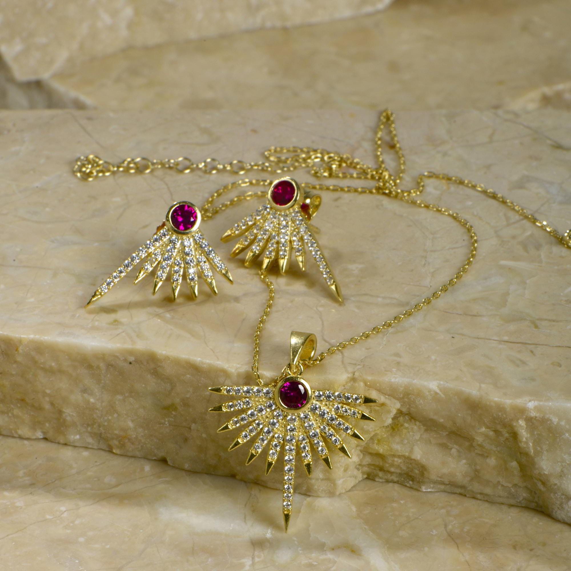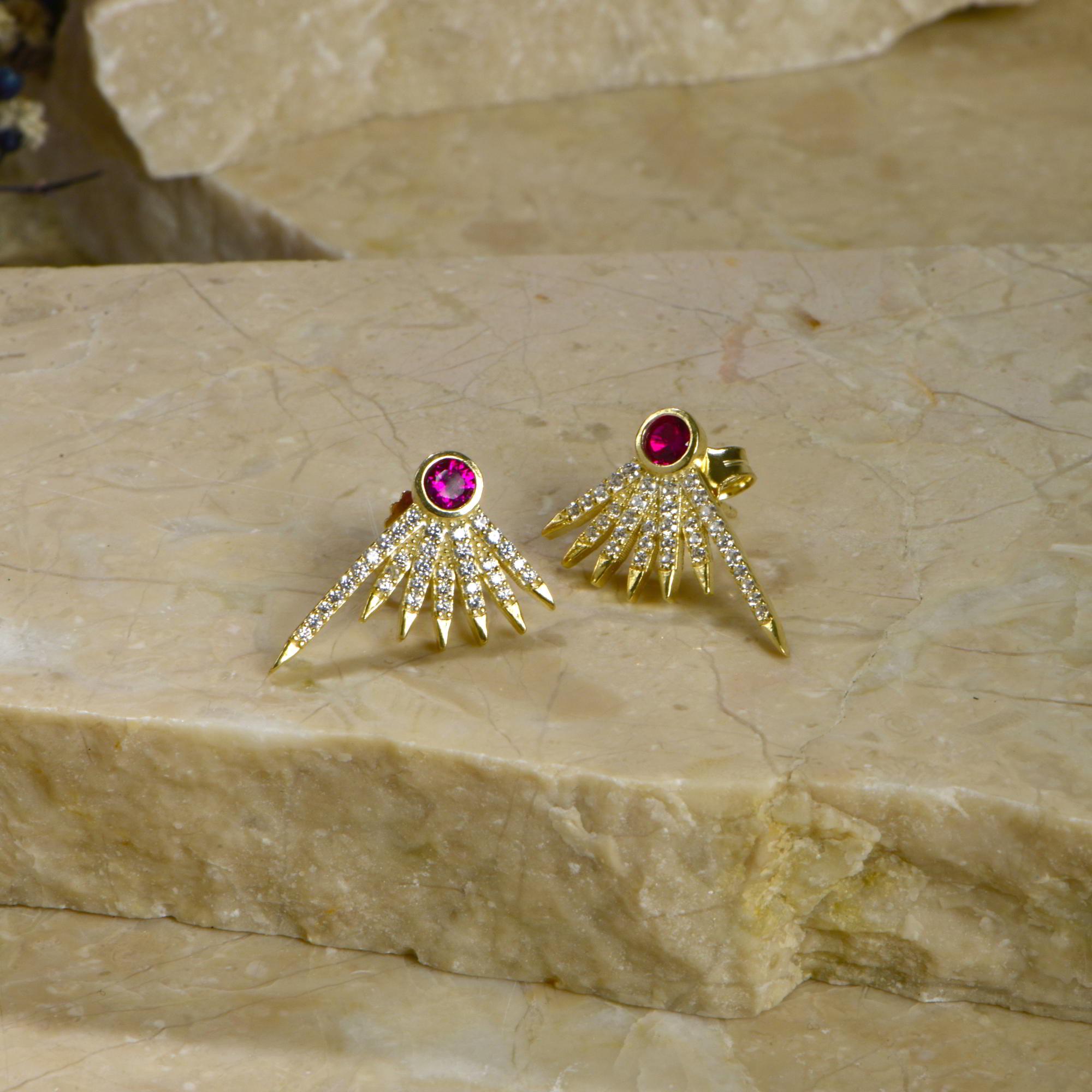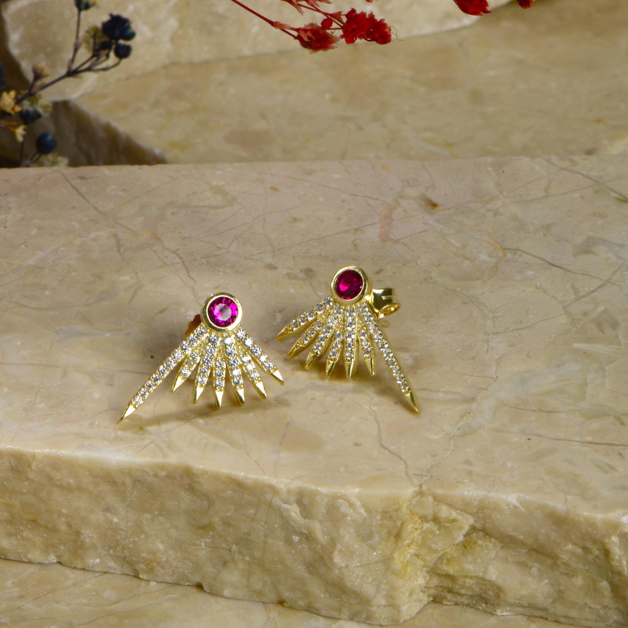 Handcrafted with love and precision, the dragonfly studs are made from 24K gold plated 925 solid sterling silver and adorned with high-quality white cubic zirconia stones. At the center, a vibrant ruby birthstone — symbolizing passion, vitality, and courage — adds a bold and meaningful touch, making them a standout gift for her or a personal everyday favorite.
