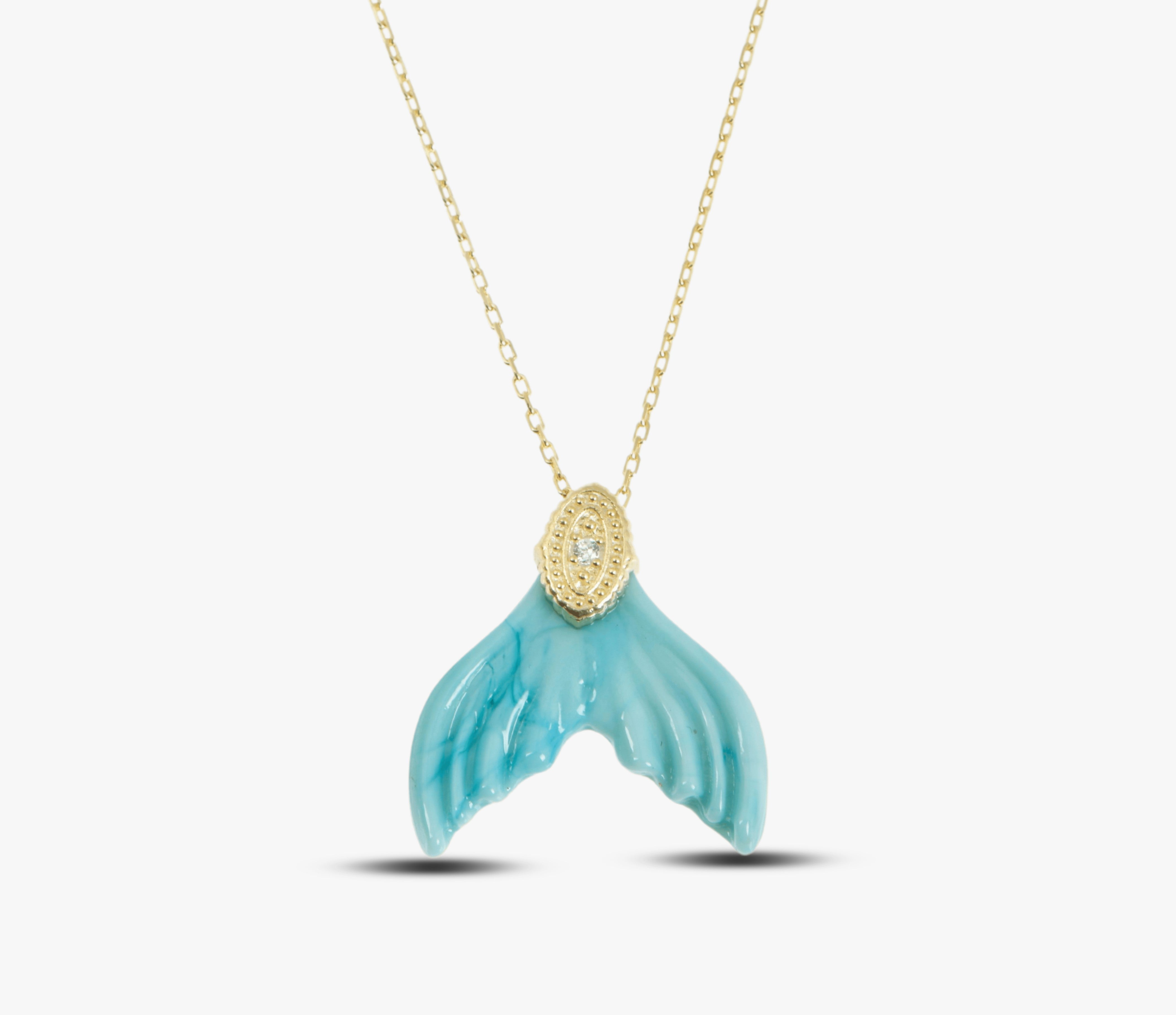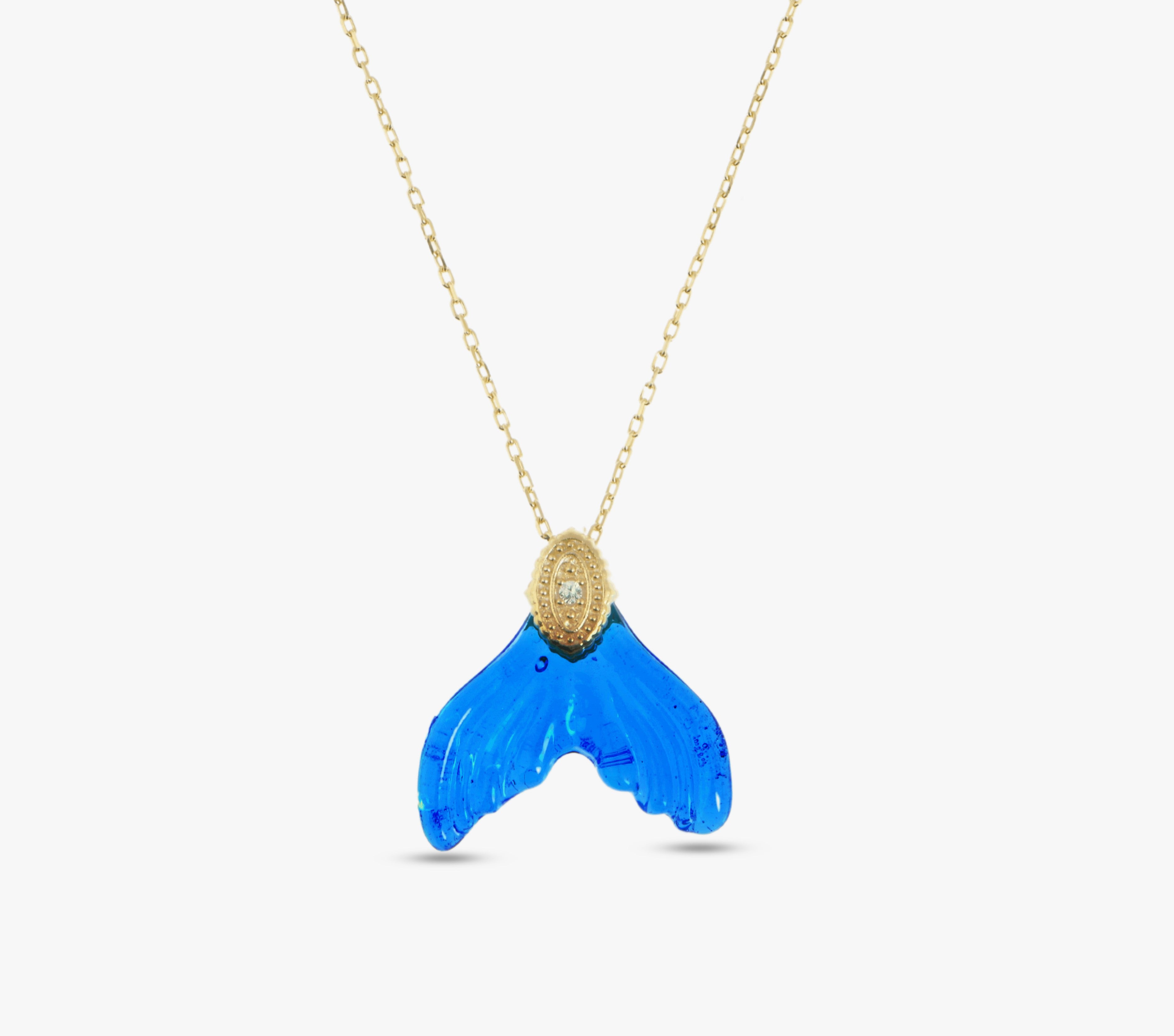 Silver Glass Carved Whale Tail Necklace is unique piece of Augusta Antonina's Glass Collection. Hand Glass Made Whale Tail Pendant has beautiful craftmanship and in the details you can see the how crafted bail and curves of the glass perfectly! This magnificent Blue Whale Tail Necklace is made from 18K Gold Plated 925 Solid Sterling Silver, glass and white cubic zirconia stones on the bail. Also have two options which is Turquoise and Navy Blue Colour. Glass Jewelry Collection of Augusta Antonina is always a great gift for yourself or for your loved one who is really curious about unique designs