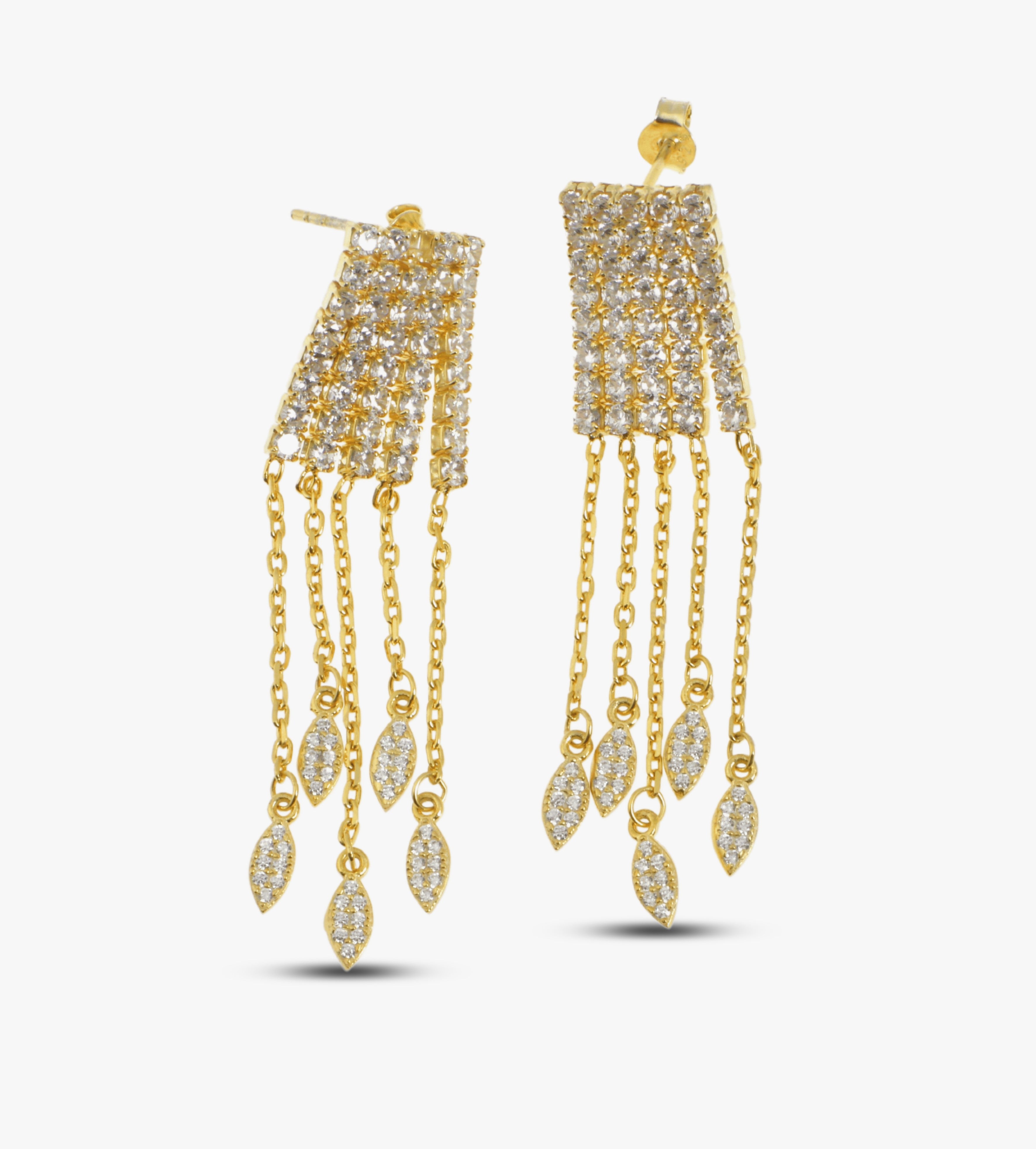 Silver Dangling CZ Diamond Chain earrings handcrafted by the finest artists with love and care. Dainty Drop CZ Diamond Chain Earrings made from 18K Gold Plated Sterling Silver, high quality white cubic zirconia stones and gold plated silver cable chains. This elegant long dangle eearrings will be perfect match to your outfit and great gift ideas for you and your loved ones.