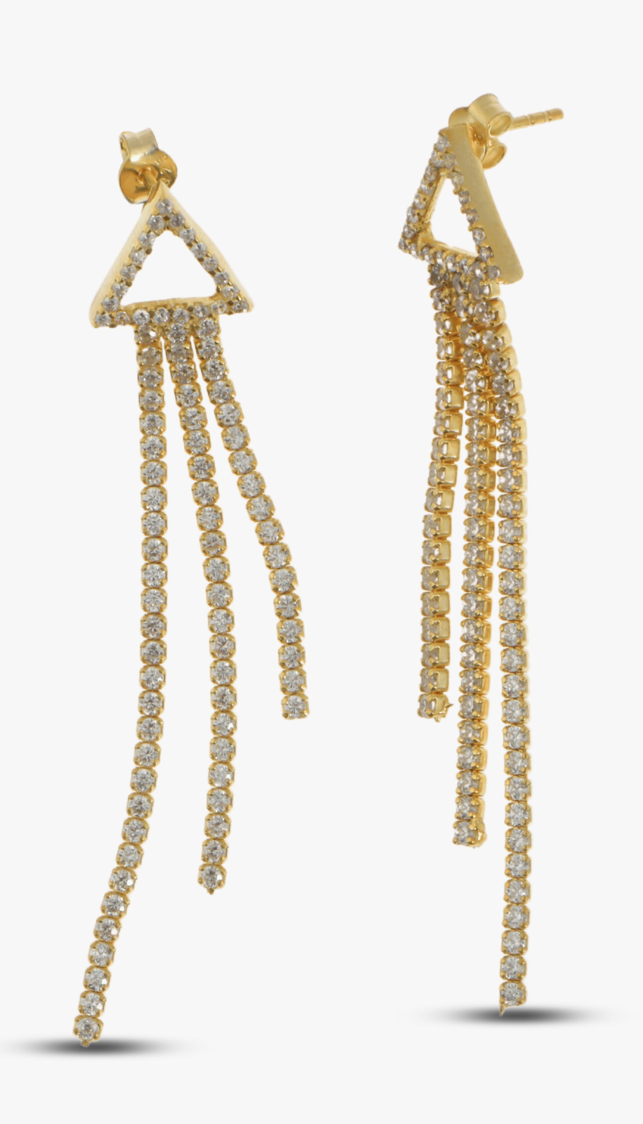 Silver CZ Diamond Chain Earring is unique piece of our collection. Stylish CZ Tennis Drop Earrings has triple strip dangle from triangle shape and has elegant look. Dangling Diamond Chain earrings handcrafted with love and care by the finest artists. Our unique elegant earrings made from 18K Gold Plated Sterling Silver and high quality white cubic zirconia stones. It will add elegant and classy look and perfect gift for you or your loved ones.
