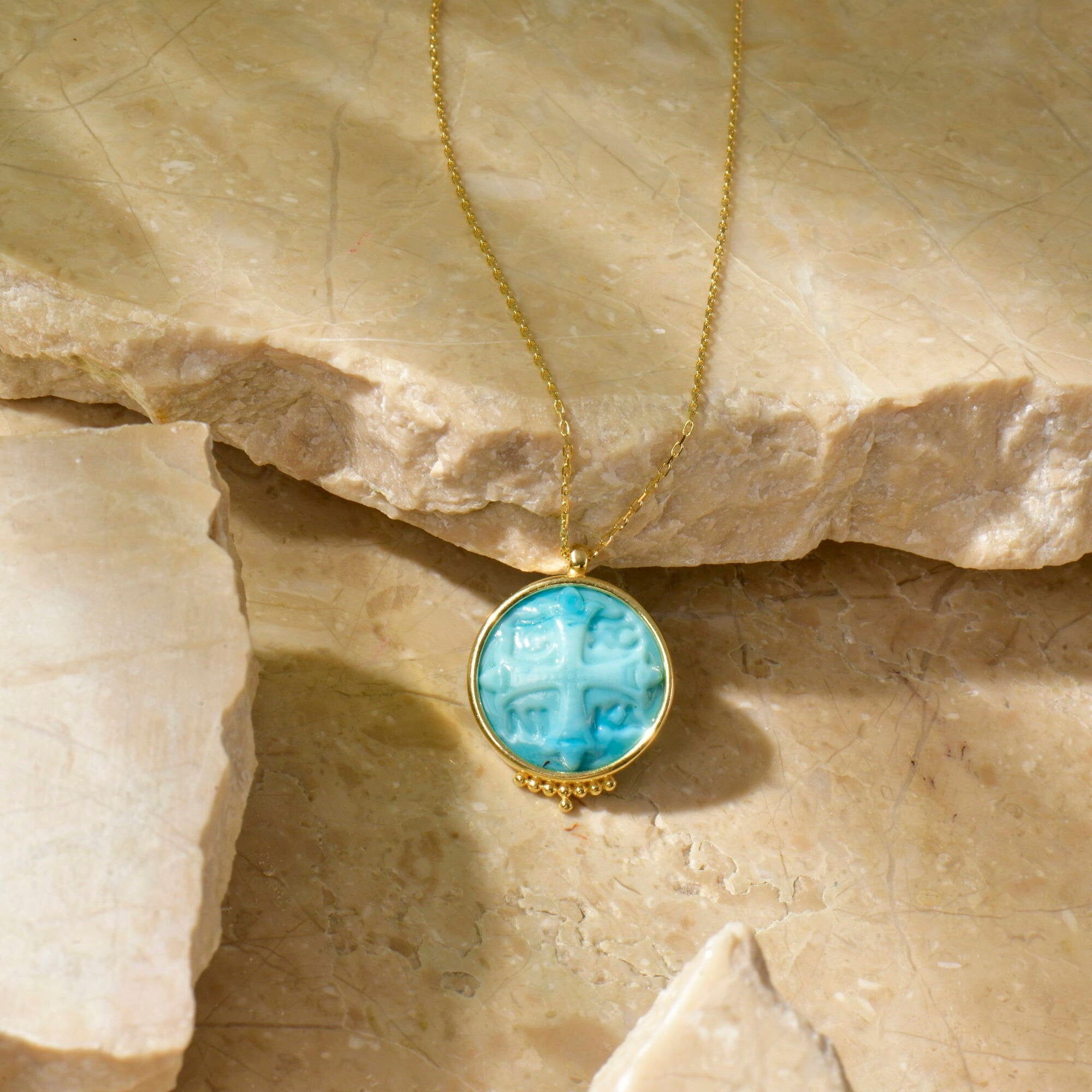 Intaglio Glass Ancient Greek Cross Necklace is unique piece of Augusta Antonina's Antique Collection. Glass Carved Silver Cross Necklace has beautiful craftmanship and in the details you can see ICXC NIKA words which means "Jesus Christ Conquers." This Byzantine Orthodox Cross Necklace is made from 18K Gold Plated 925 Solid Sterling Silver and glass. Antique Glass Jewelry is always a great gift for yourself or for your loved one who is really curious about history, mythology and design that has story behind it.