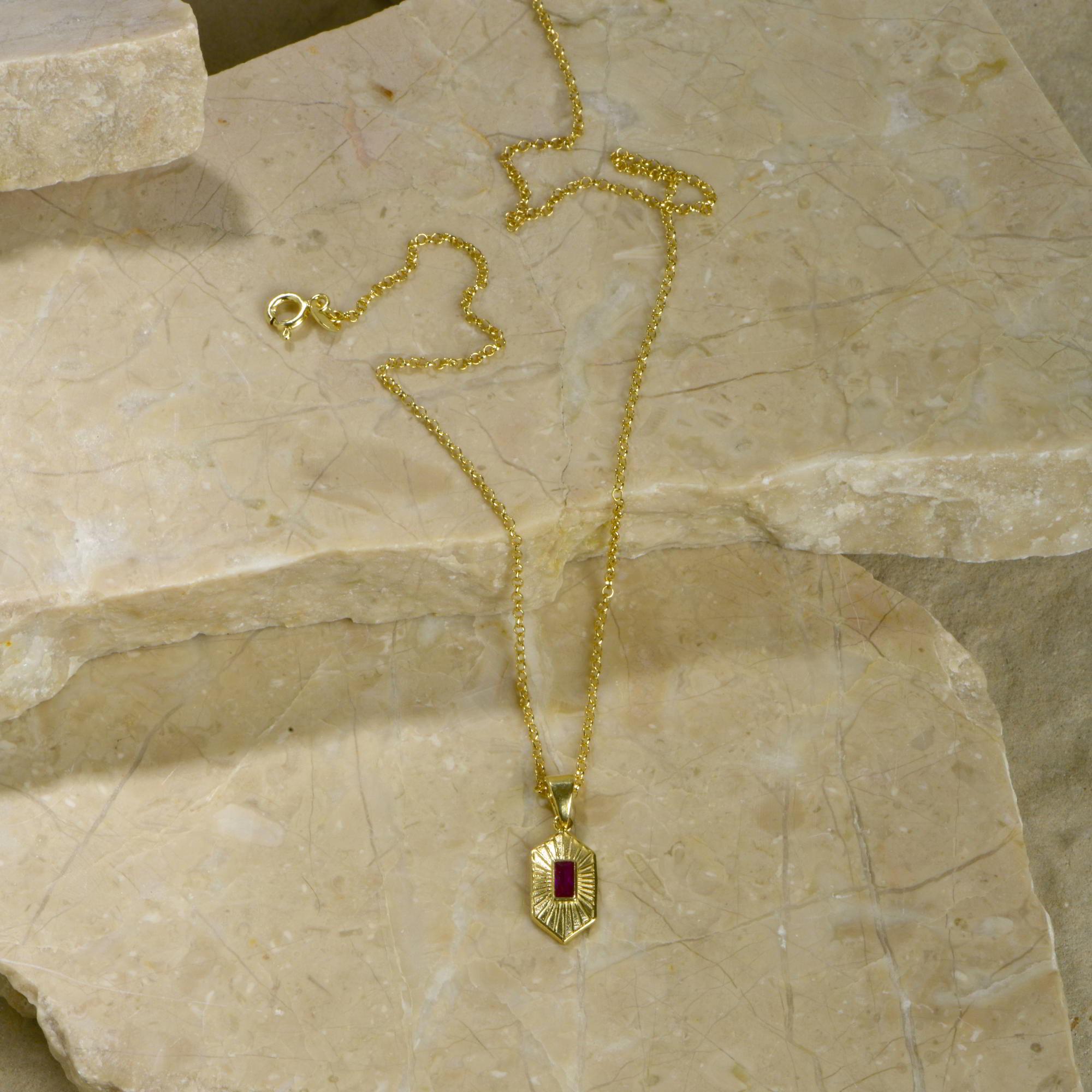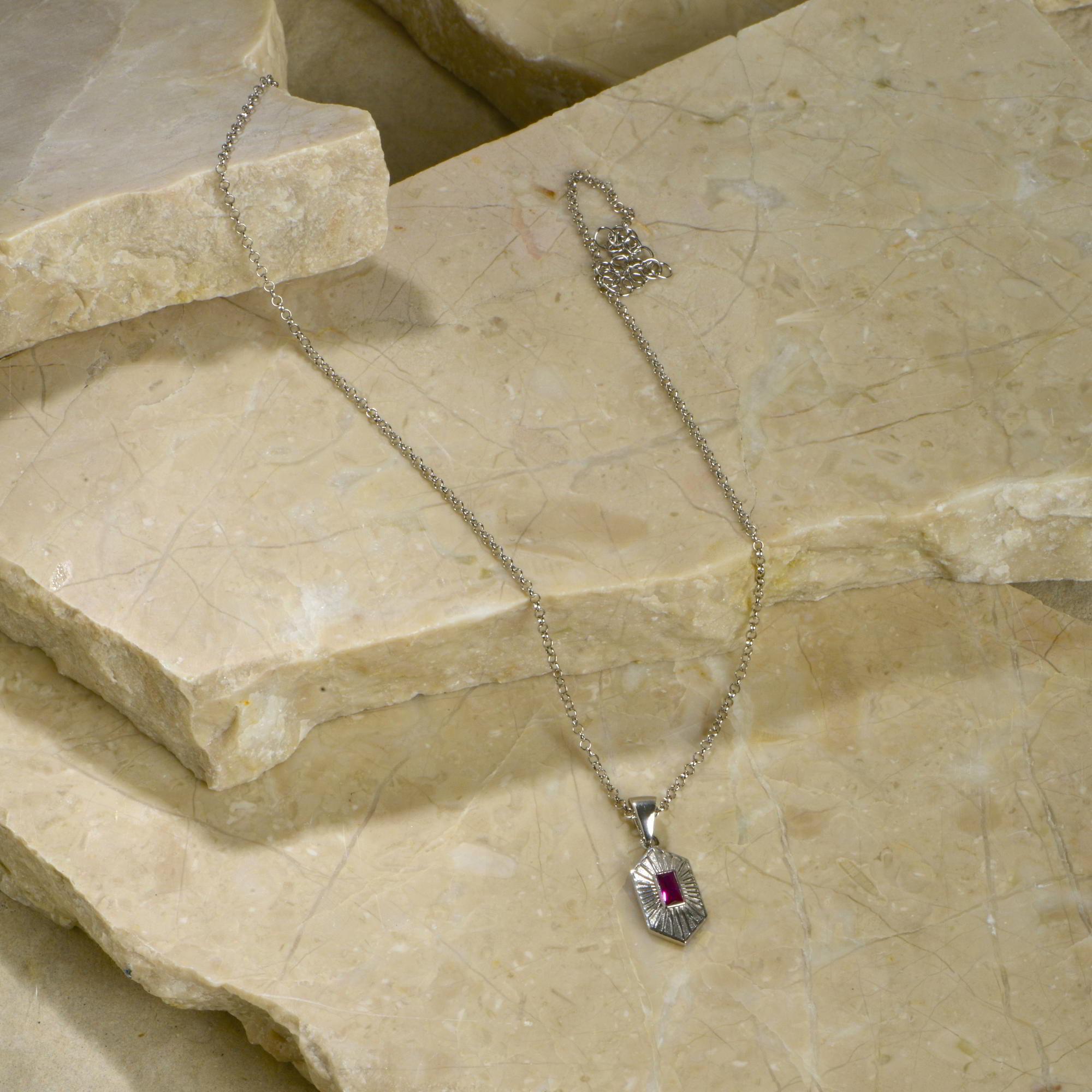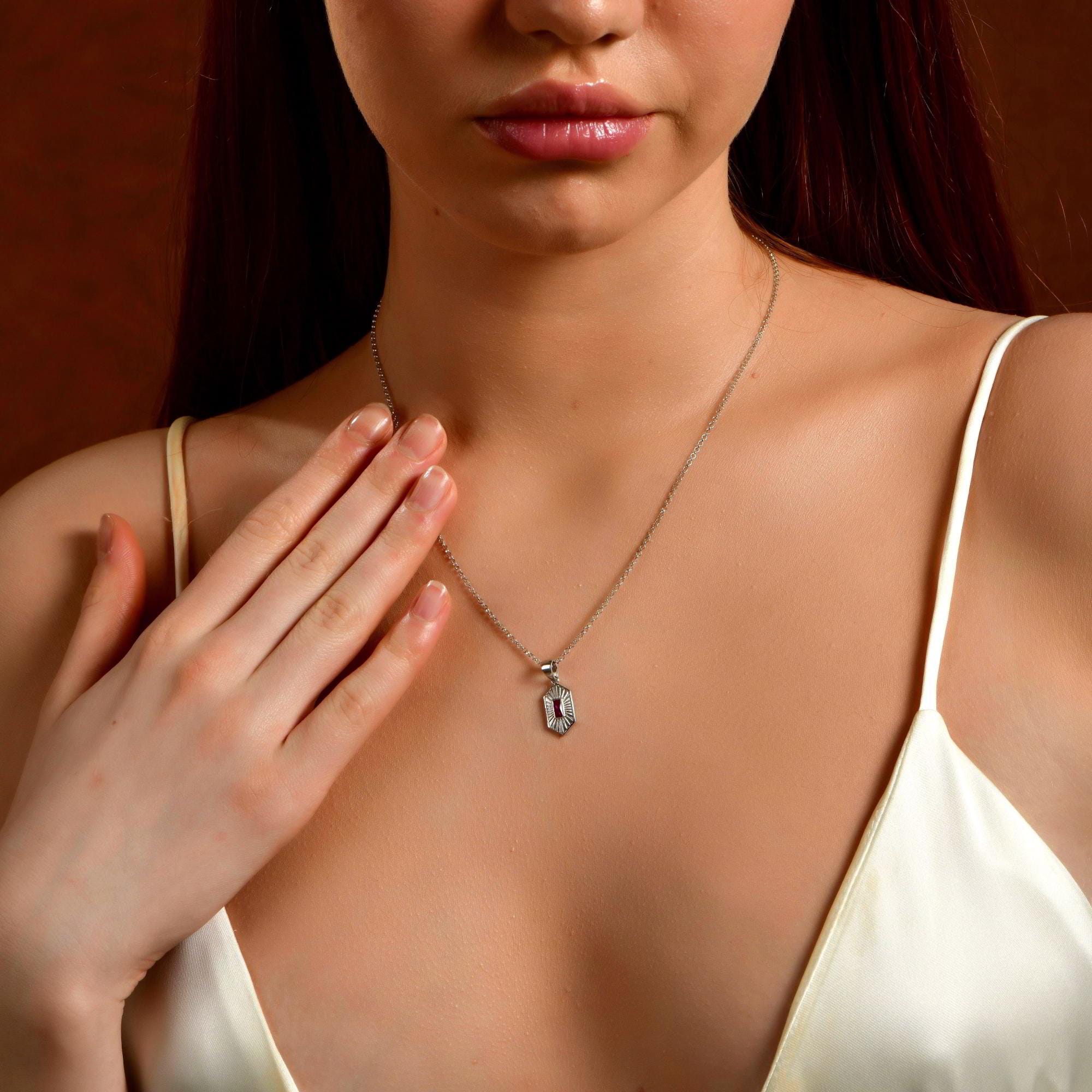 Whether you’re looking for a July birthstone necklace, a minimalist geometric pendant, or a dainty baguette-cut ruby diamond necklace, this piece is a perfect addition to your jewelry wardrobe or a thoughtful gift for her.