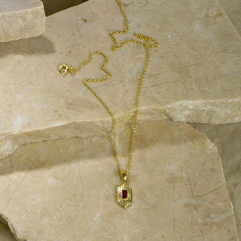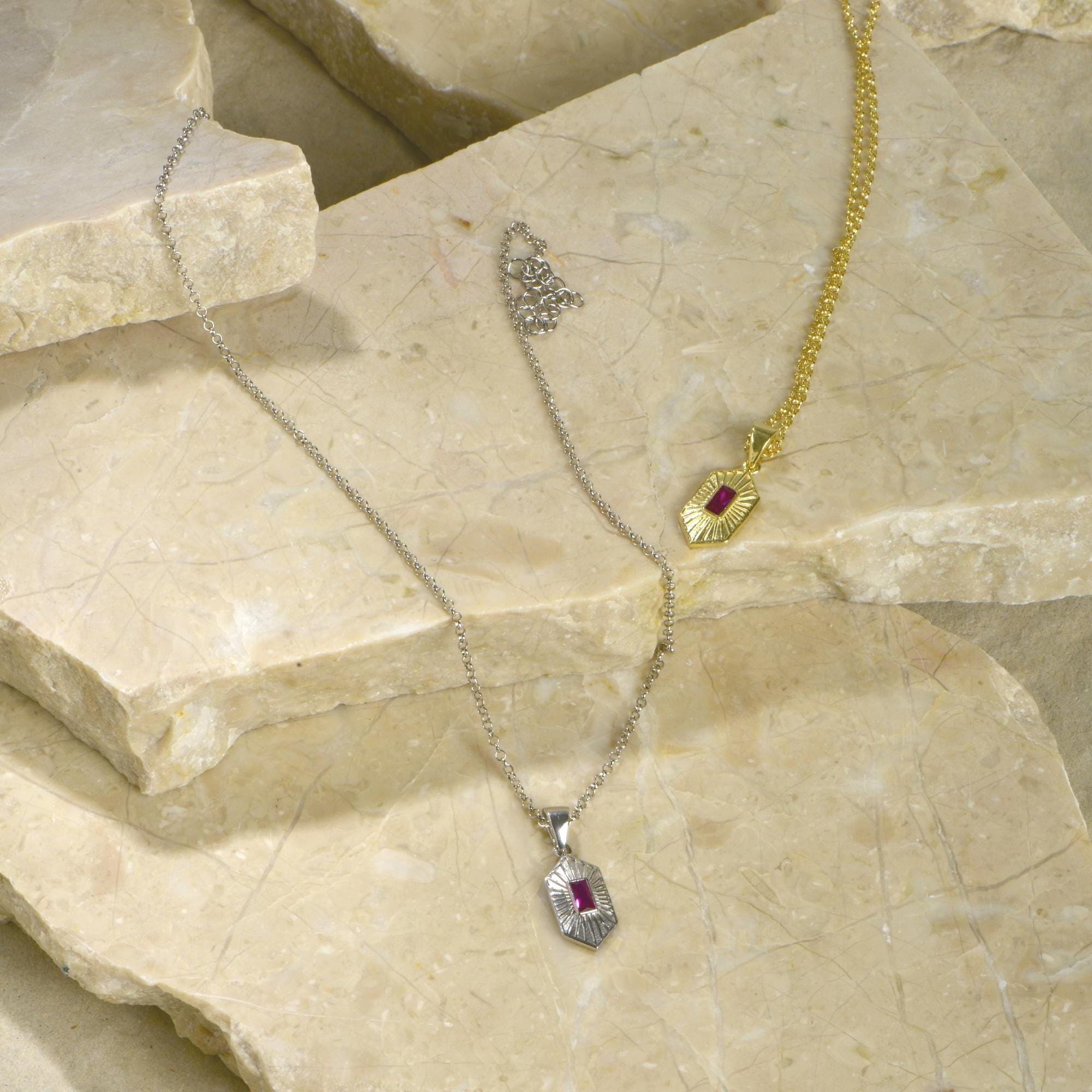 Our 24K gold-plated and silver-finished options allow you to choose your perfect match, while the July birthstone adds a deep, celestial sparkle. Also available in other vibrant stone options—amethyst, sapphire, diamond, and emerald cubic zirconia—this geometric necklace is designed to celebrate individuality and sophistication.
