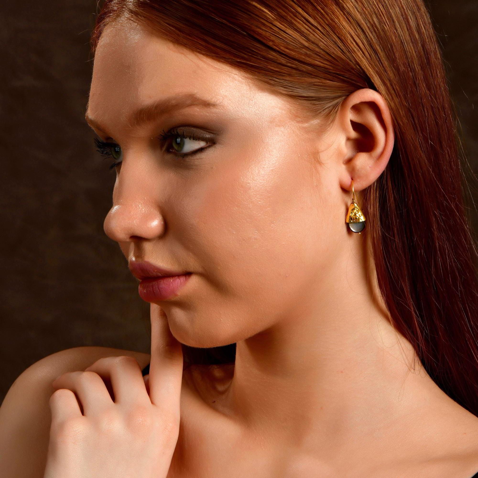 Each earring showcases a genuine black mother of pearl stone, carefully set beneath an intricately designed 24K gold plated bead cap. The natural gemstone is skillfully threaded through hand-shaped fine silver wire, while the bead cap provides a refined shell-like detail that enhances the deep, iridescent glow of the pearl.