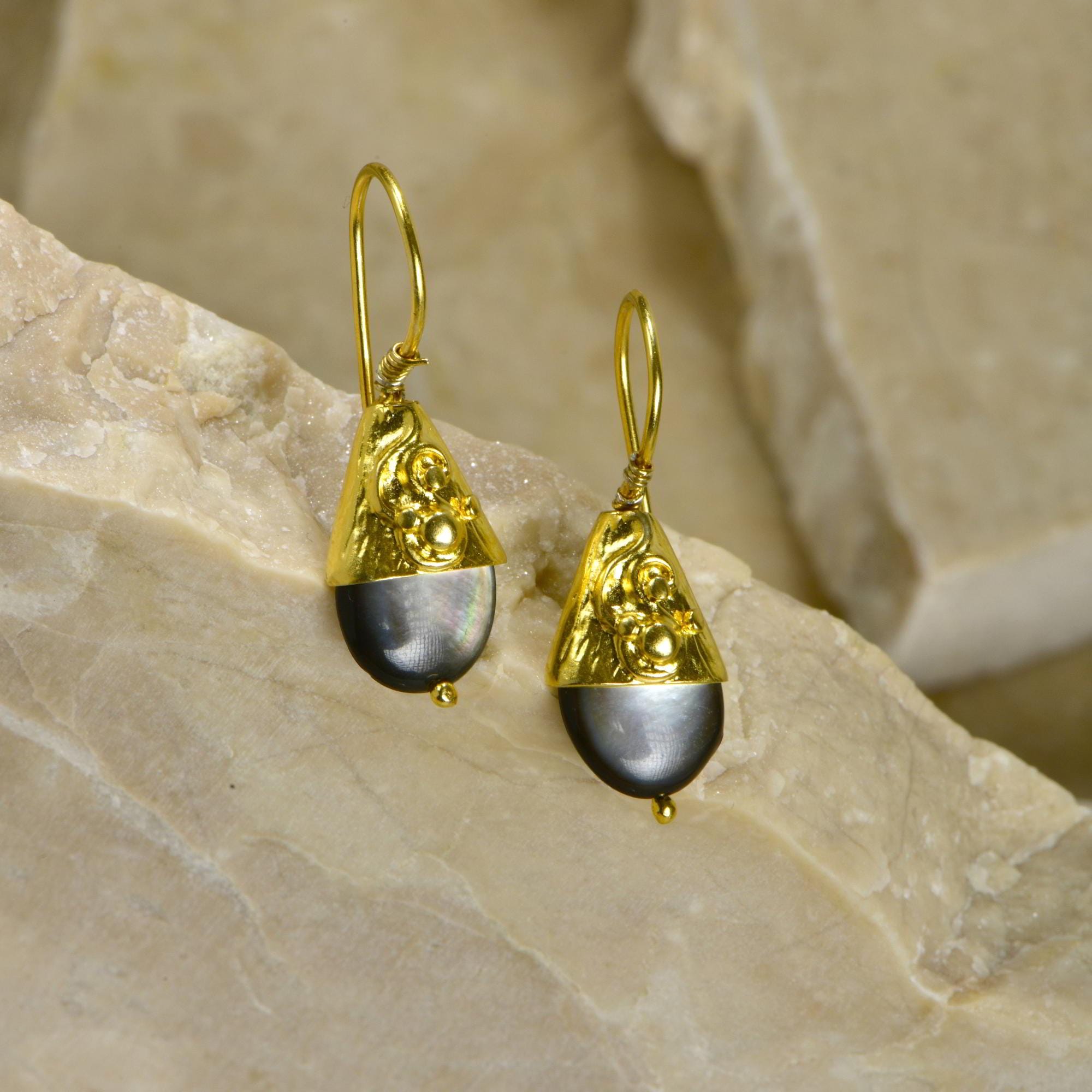Each earring features a genuine white or black mother of pearl stone, delicately fitted into an intricately designed 24K gold plated bead cap. The natural mother of pearl is carefully threaded through hand-shaped fine silver wire, with the bead cap giving the design a refined shell-like elegance while securely suspending the gemstone.