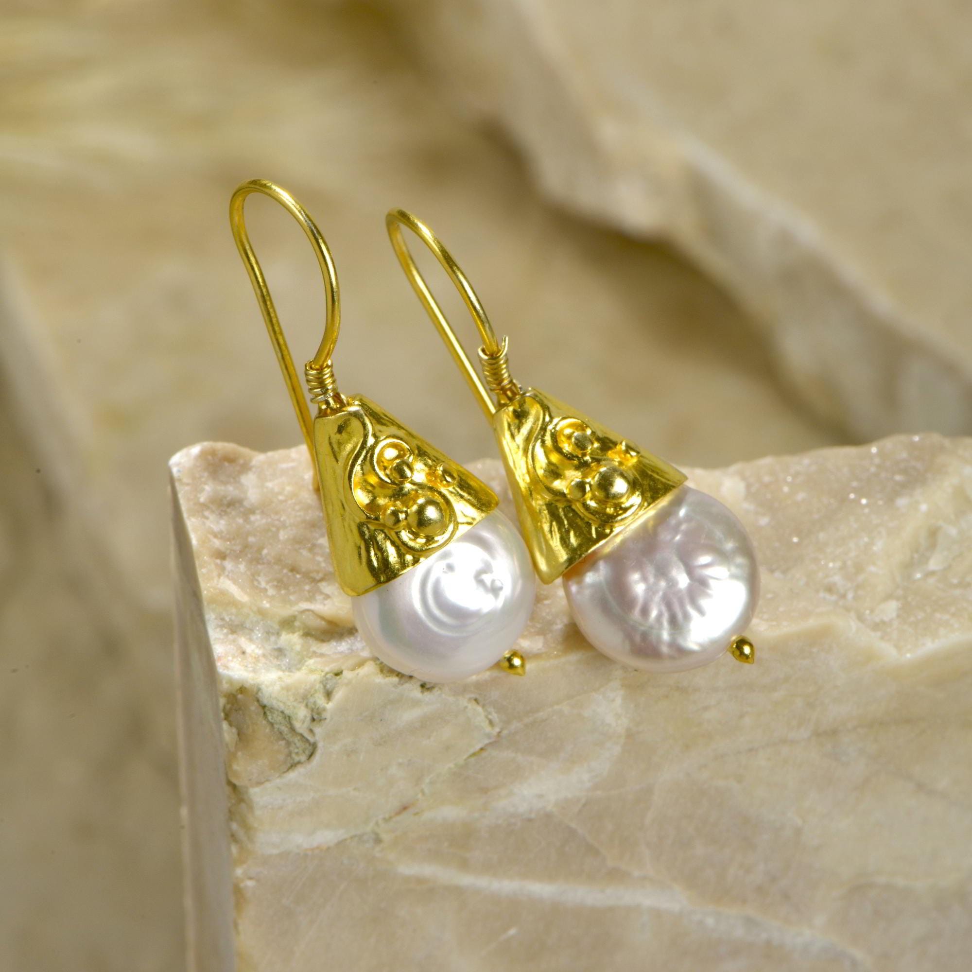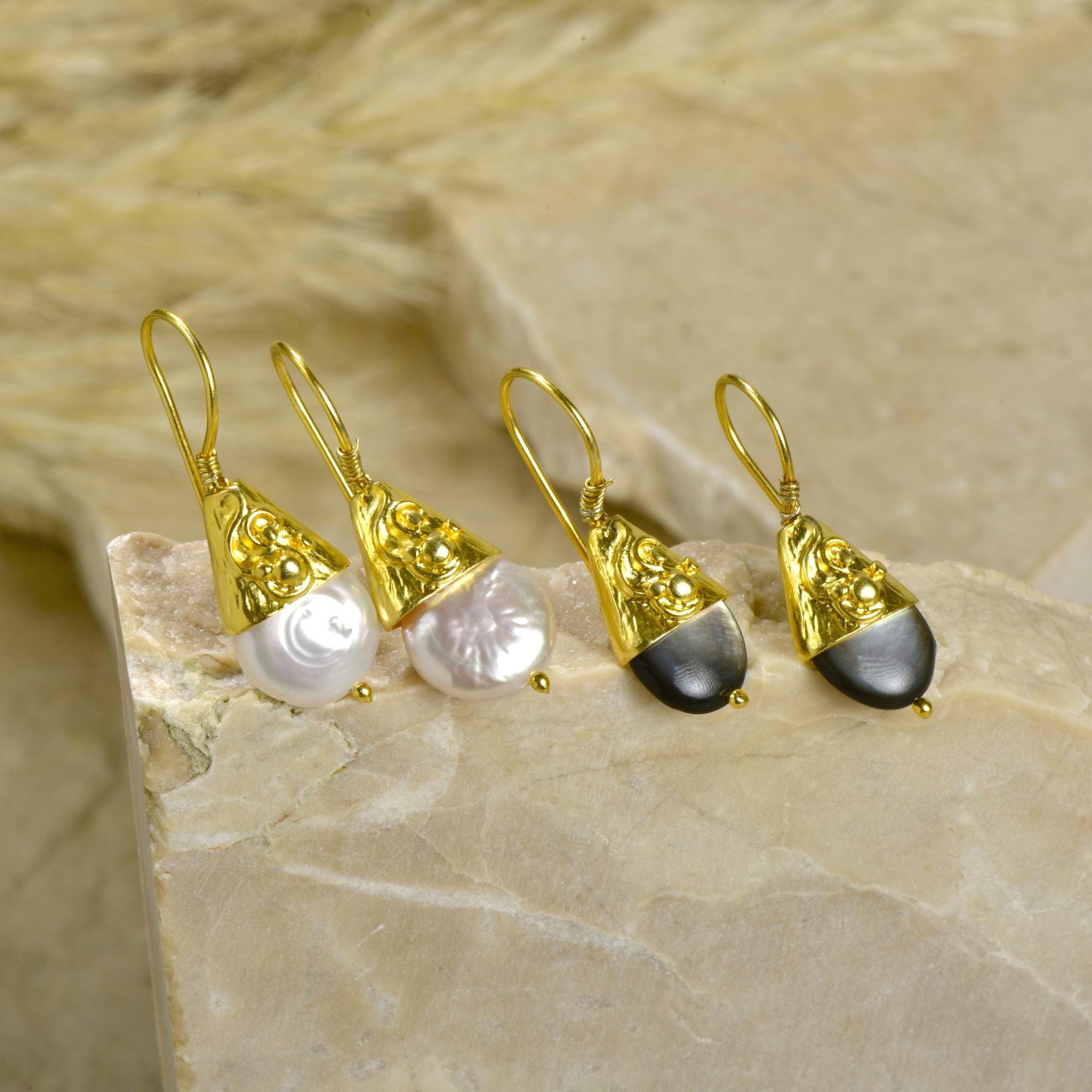 Each earring features a genuine white mother of pearl stone, delicately fitted into an intricately designed 24K gold plated bead cap. The natural pearl is carefully threaded through hand-shaped fine silver wire, with the bead cap giving the design a refined shell-like elegance while securely suspending the gemstone.