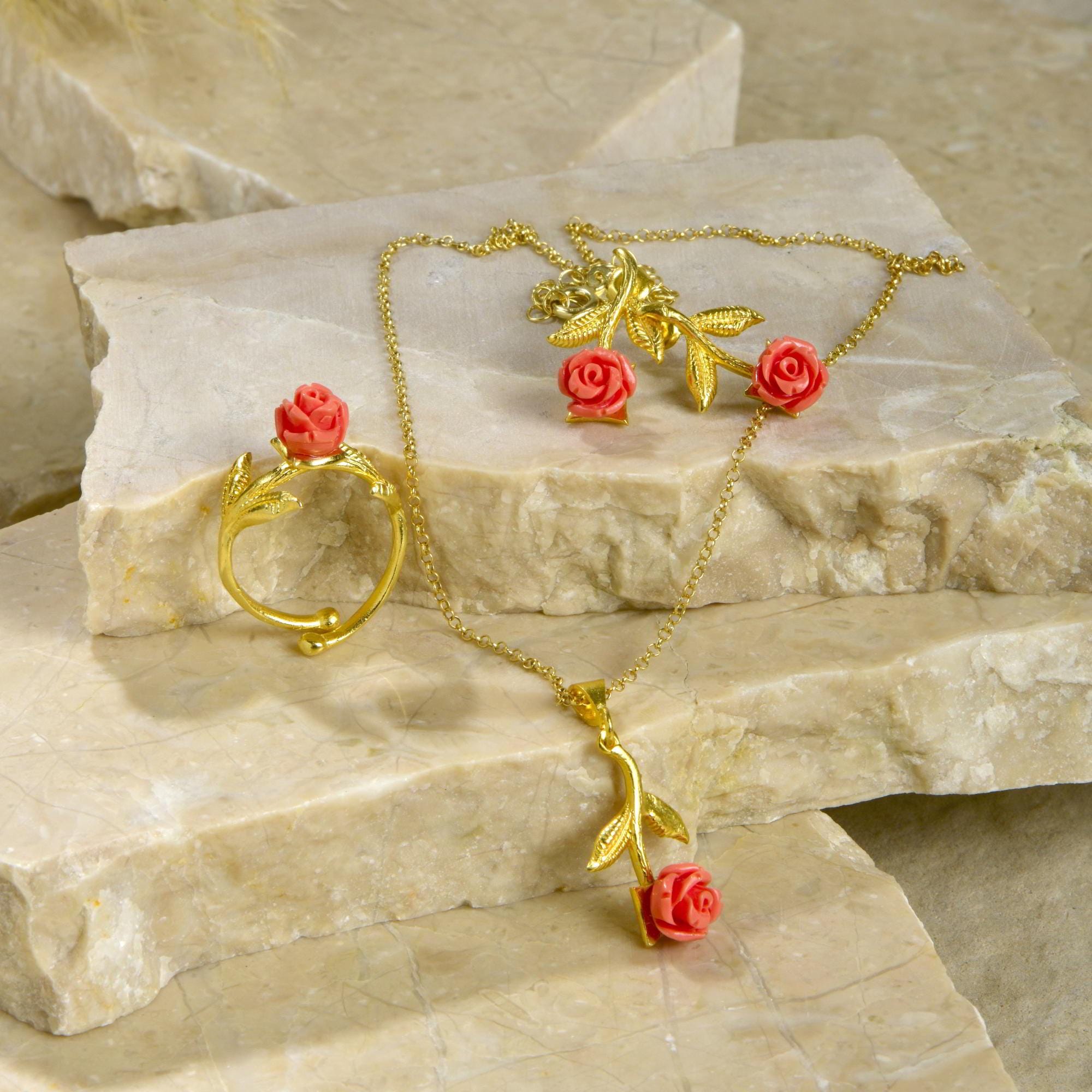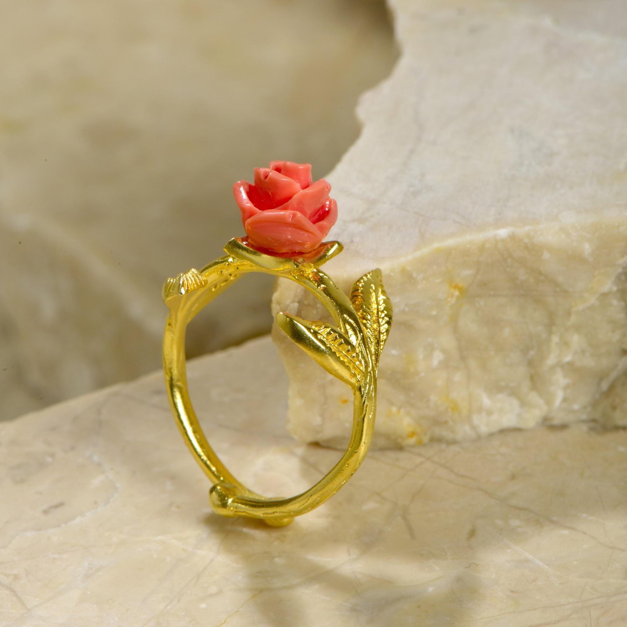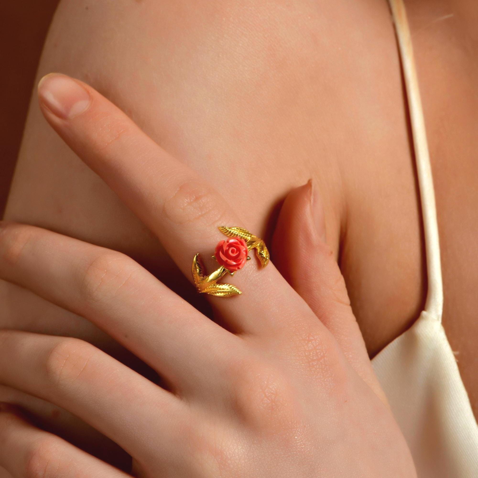 Made from 925 solid sterling silver with a luxurious 24K gold plating, the ring showcases the soft, romantic tones of angel skin coral, shaped into a graceful rose motif that evokes a sense of vintage refinement. Its artisanal craftsmanship and intricate details make it a true wearable work of art.