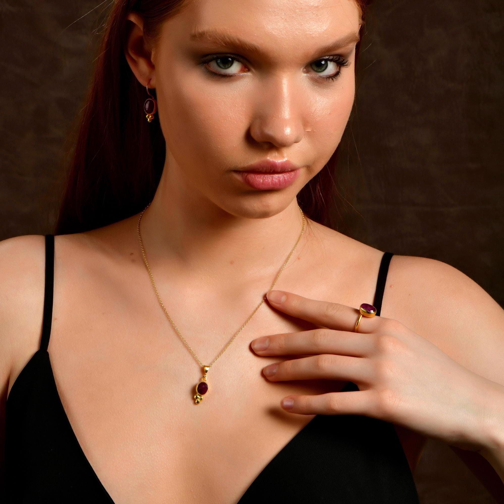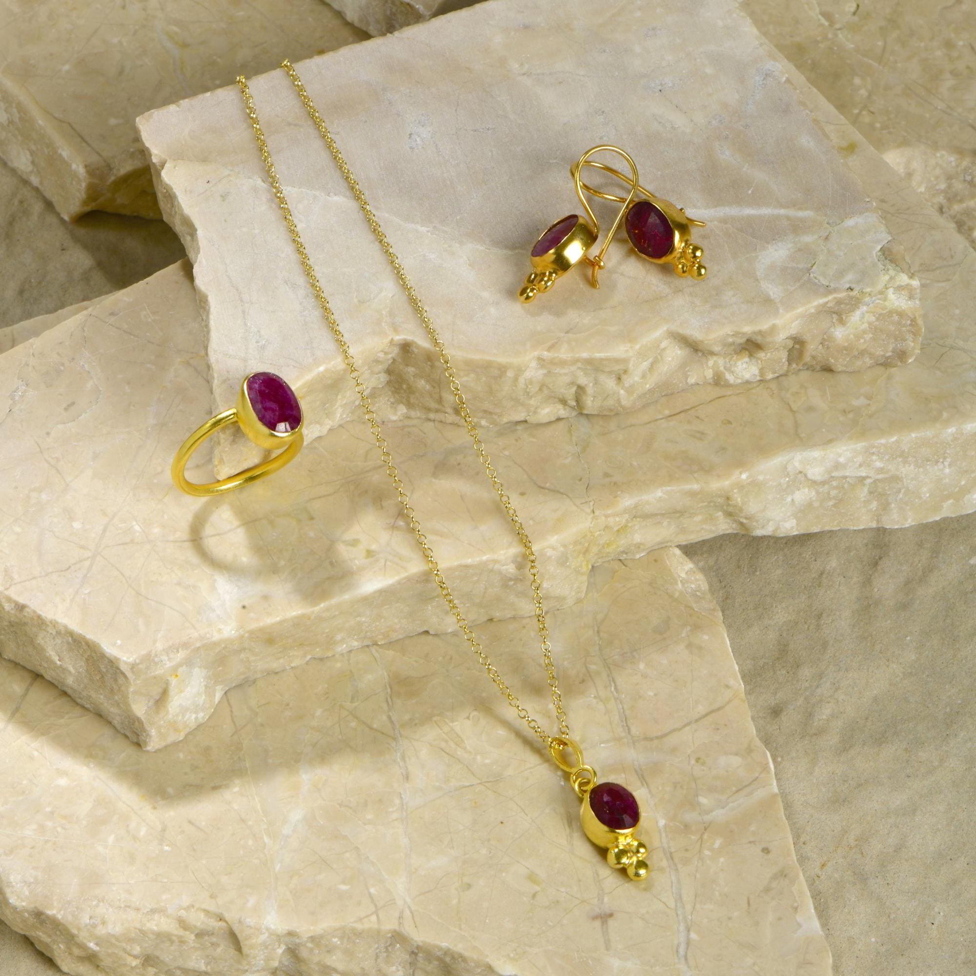 For a coordinated look, pair these earrings with the matching Ruby Necklace and Ring from the same collection to create a complete gemstone jewelry set.