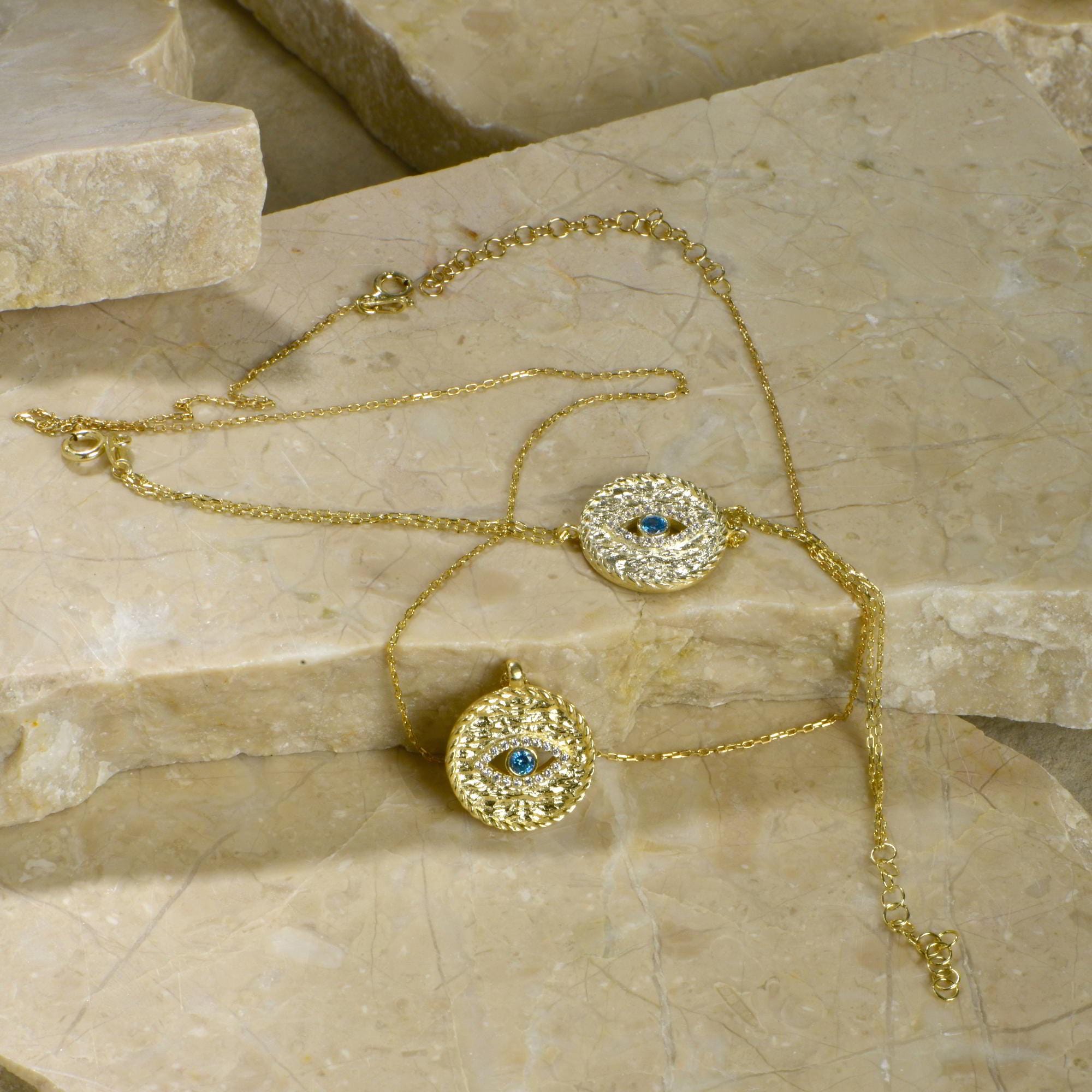Vintage Evil Eye Medallion Also available in an emerald green stone option, this delicate necklace is ideal for everyday wear or meaningful gifting. Its minimalist yet spiritual charm makes it a versatile piece to wear solo or layered with your favorite chains.