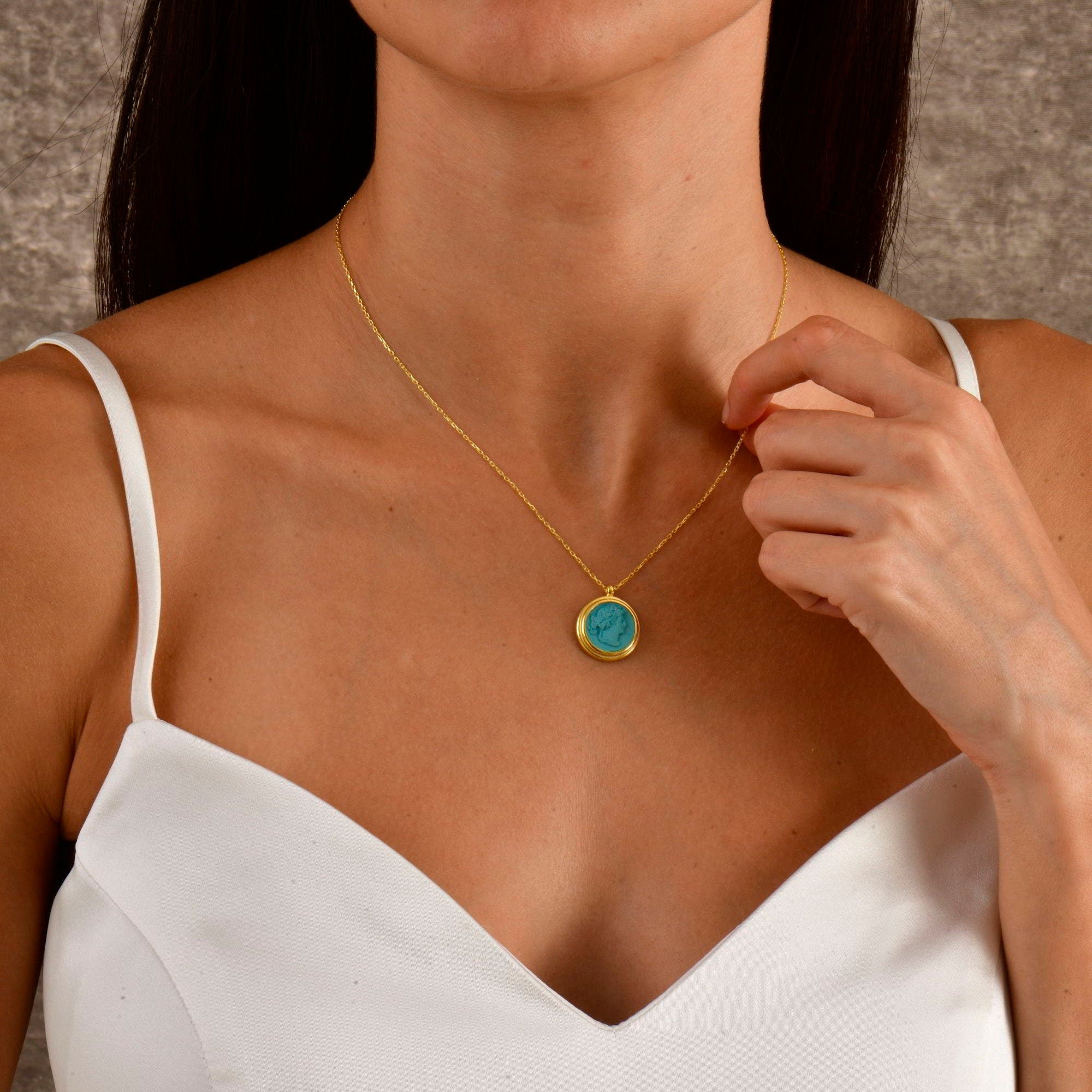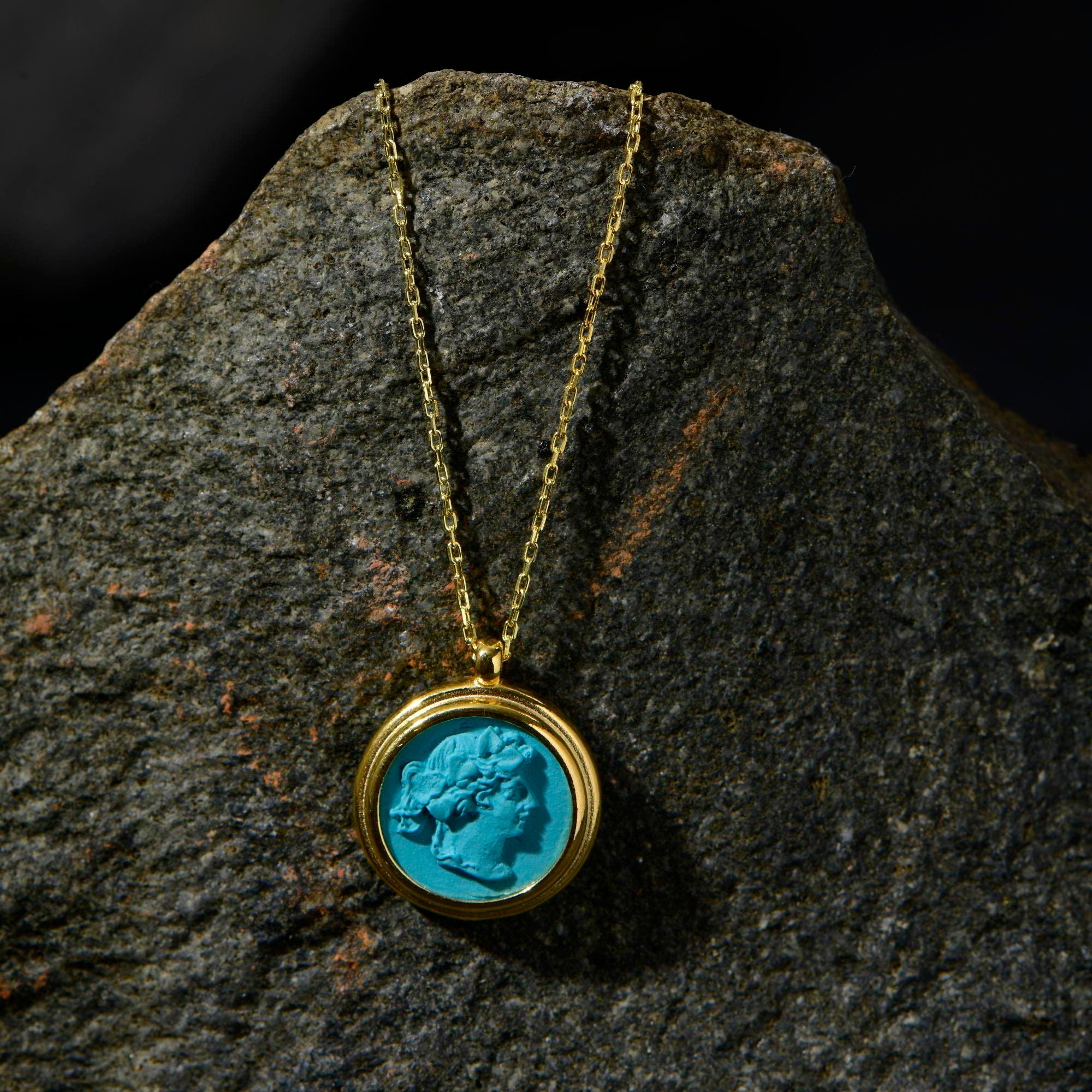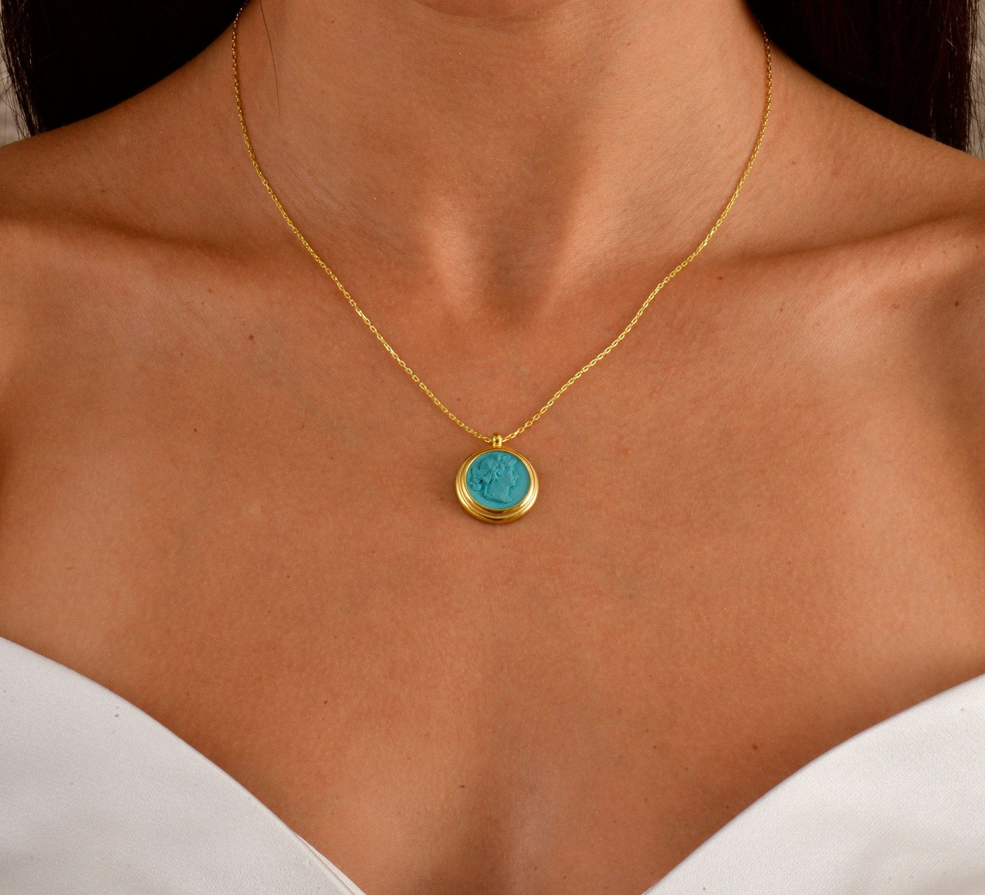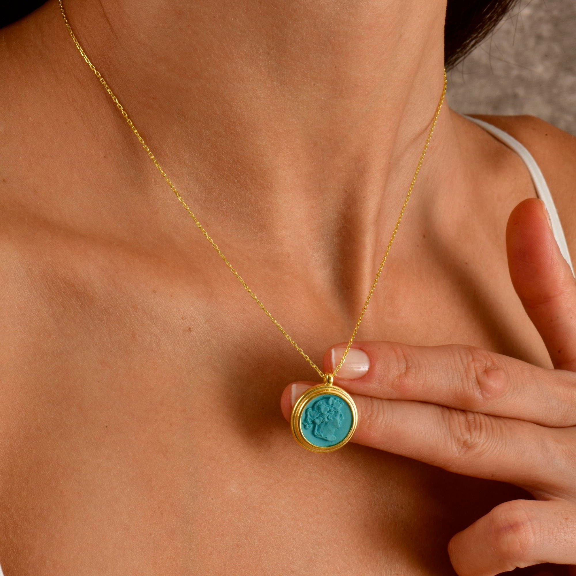 Silver Intaglio Aphrodite Necklace is unique piece of Augusta Antonina's Antique Collection. 18K Gold Plated Greek Medallion Necklace made based on the exact original figure and has beautiful craftmanship. This Ancient Mythological Figure Necklace is made from 18K Gold Plated 925 Solid Sterling Silver and resin. Our gorgeous design will attract you with every detail. Antique Jewelry is always a great gift for yourself or for your loved one who is really curious about history.