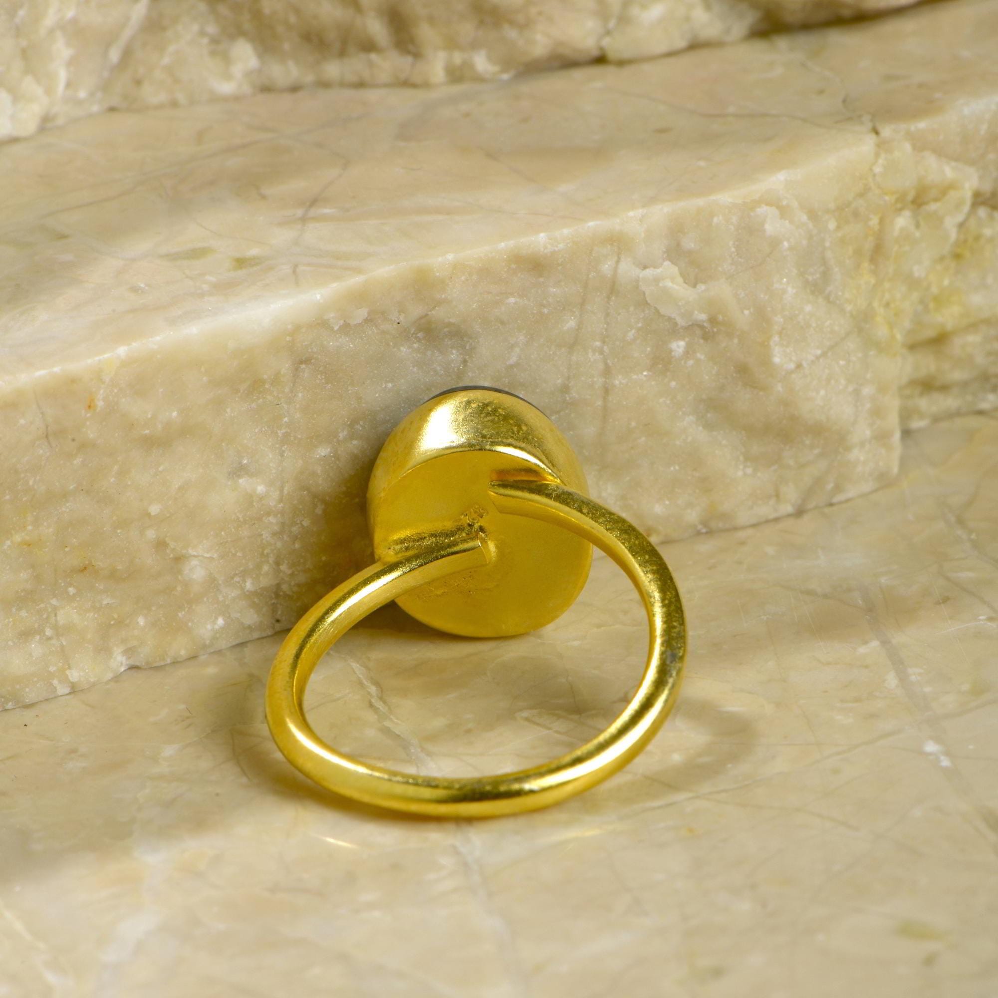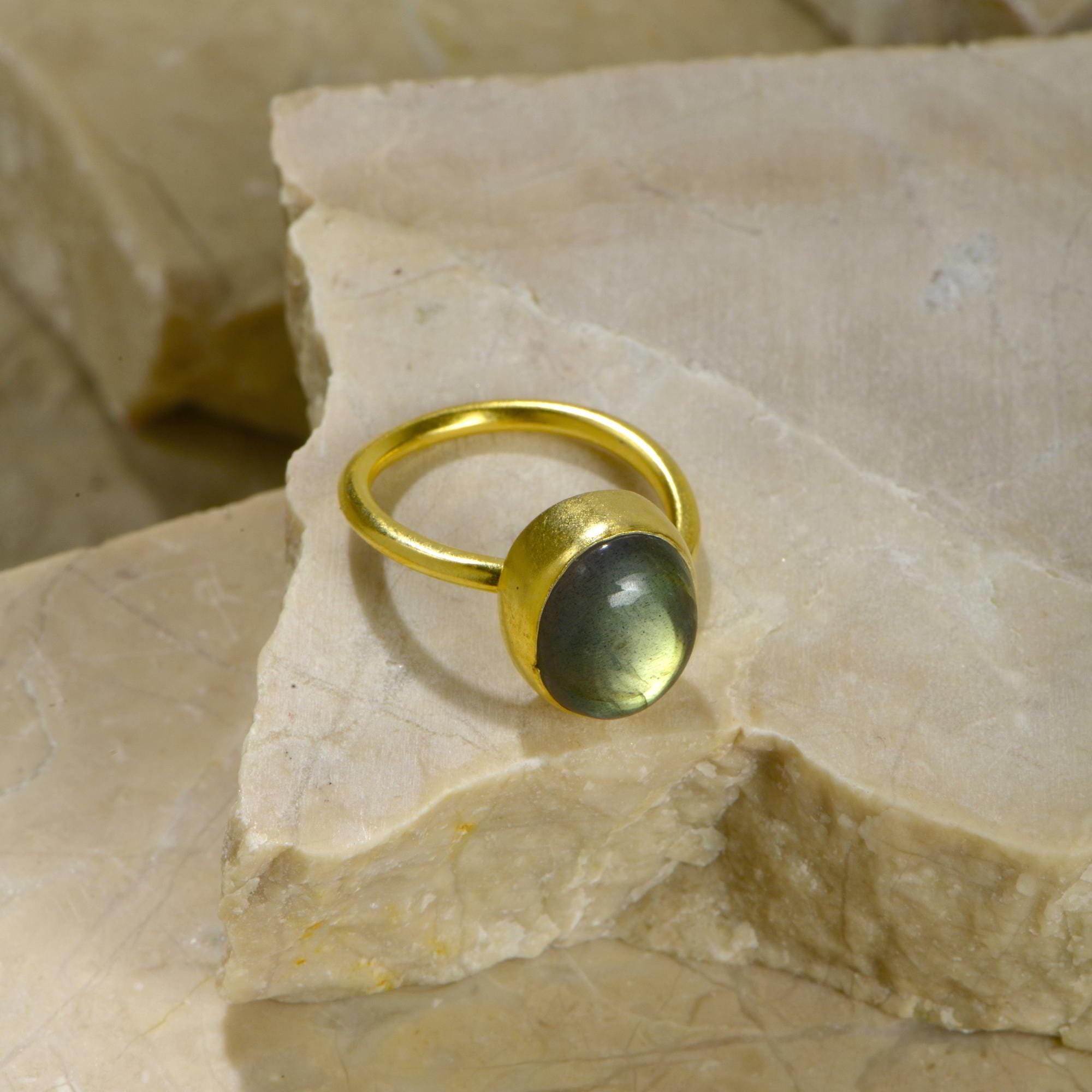 Made from high quality 925 solid sterling silver and finished in 24K gold plating, the ring showcases a luminous silver oval cut labradorite stone, radiating mystical flashes of color with every movement. Its adjustable free-size band ensures both versatility and comfort, making it a perfect accessory for everyday wear or special occasions.