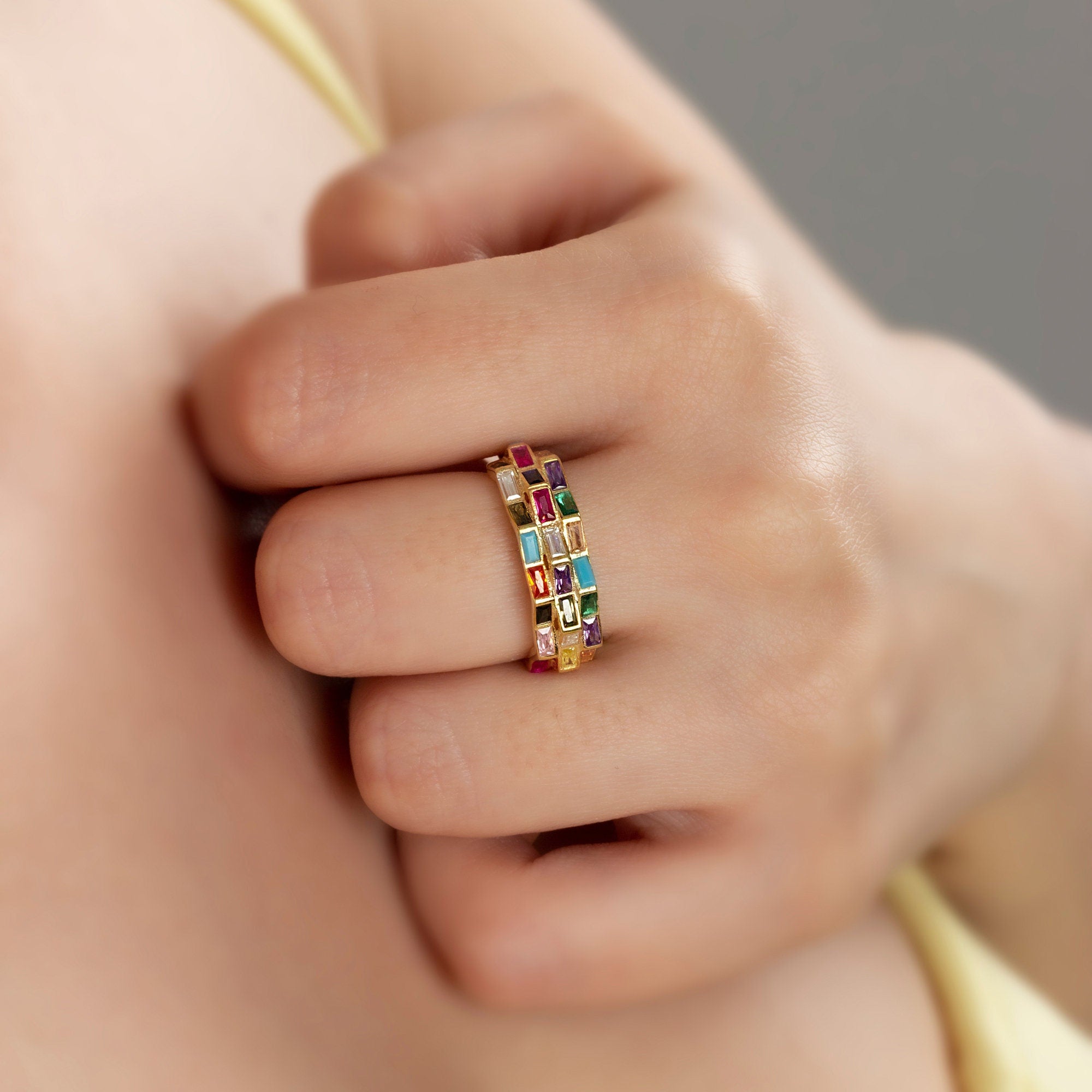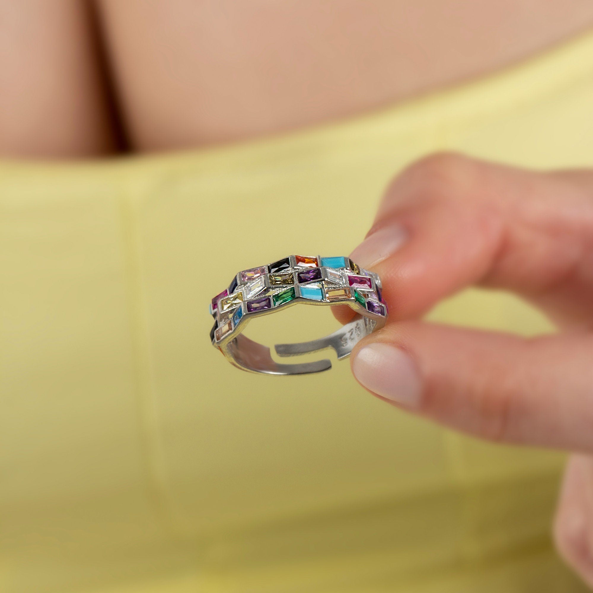 Silver Rainbow CZ Diamond Ring, 18K Gold Plated Rainbow CZ Ring, Adjustable Multicolor Ring, Colorful Stackable Ring, Christmas Gift For Her