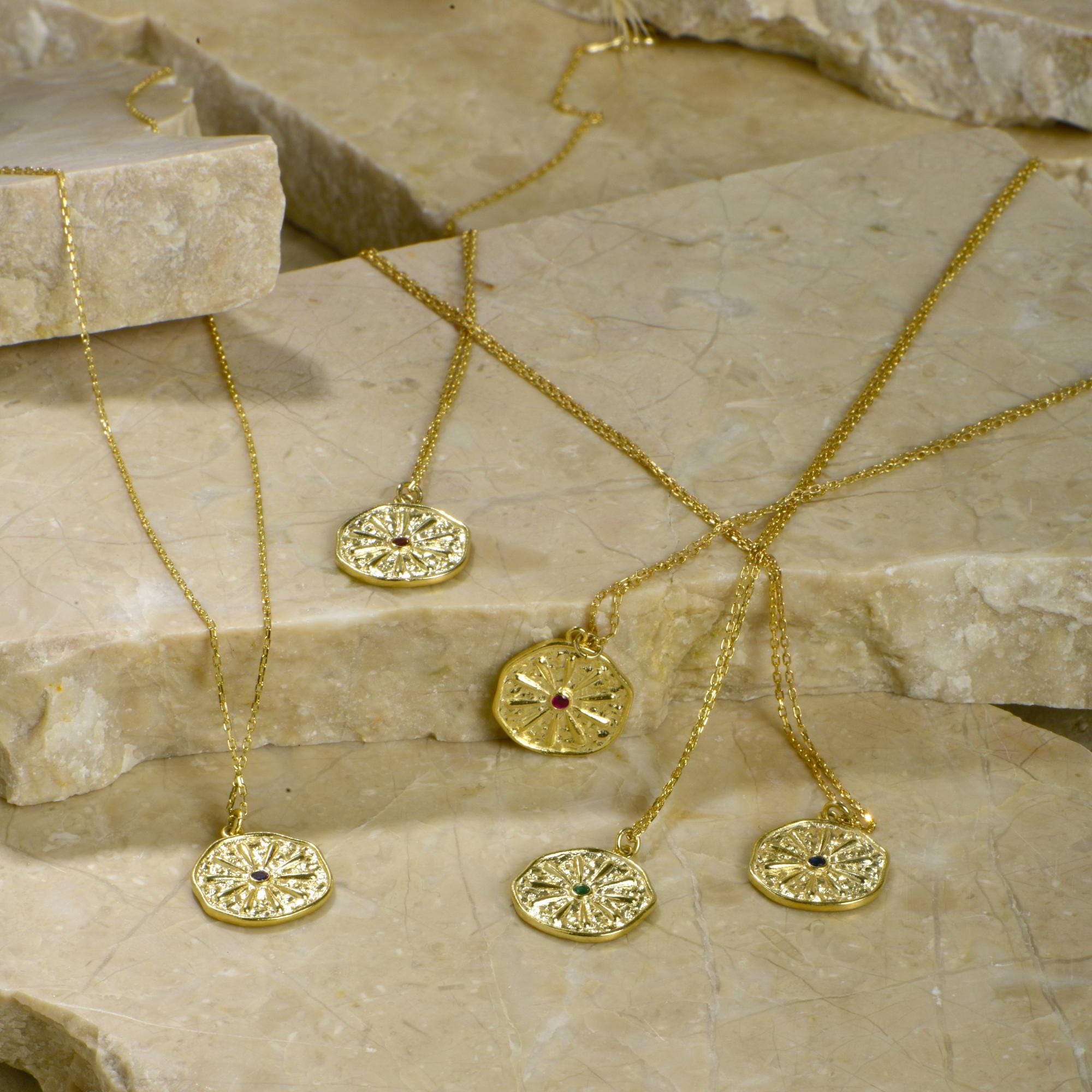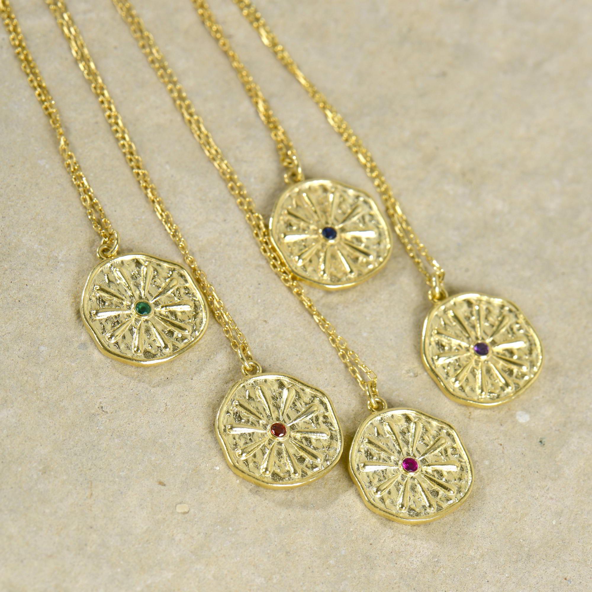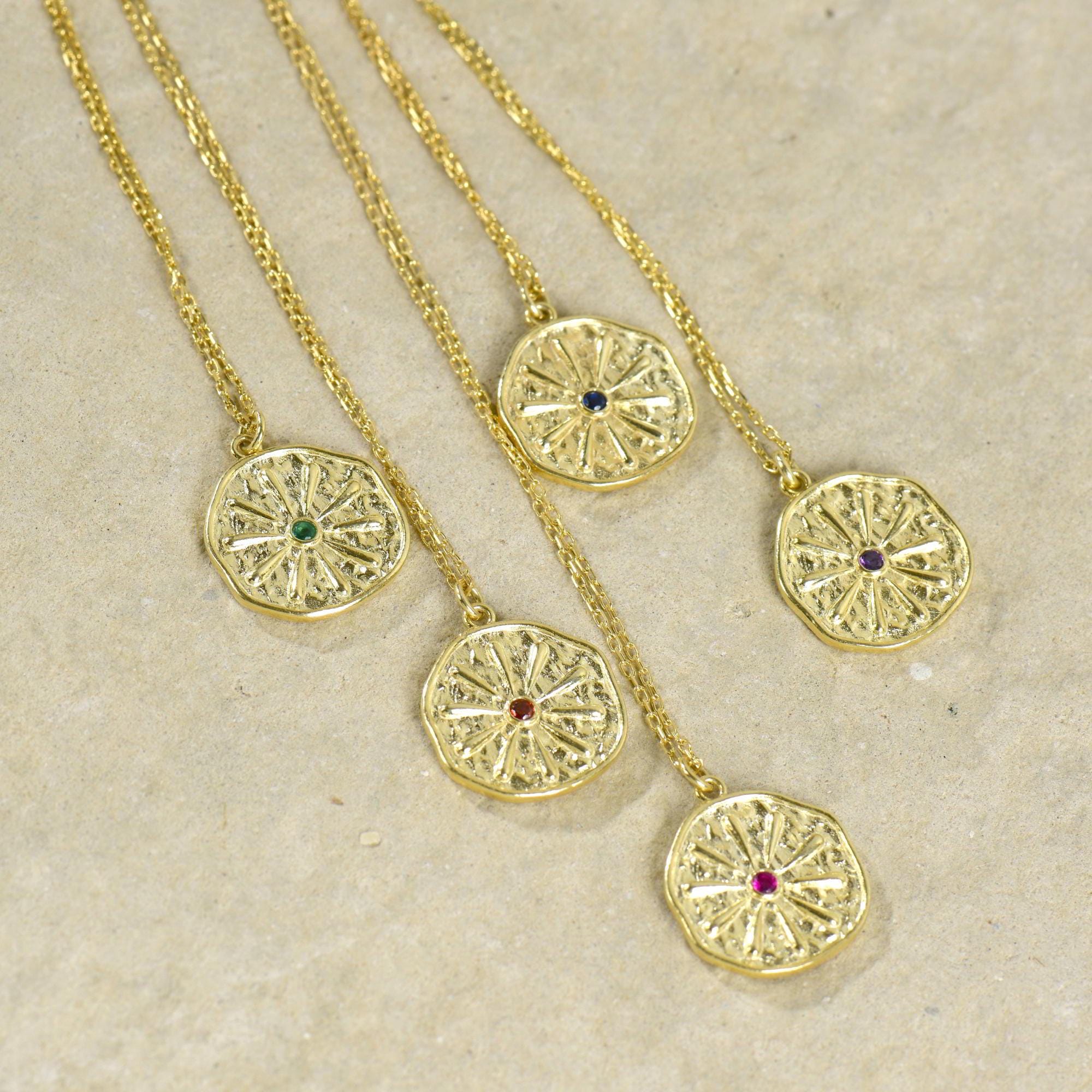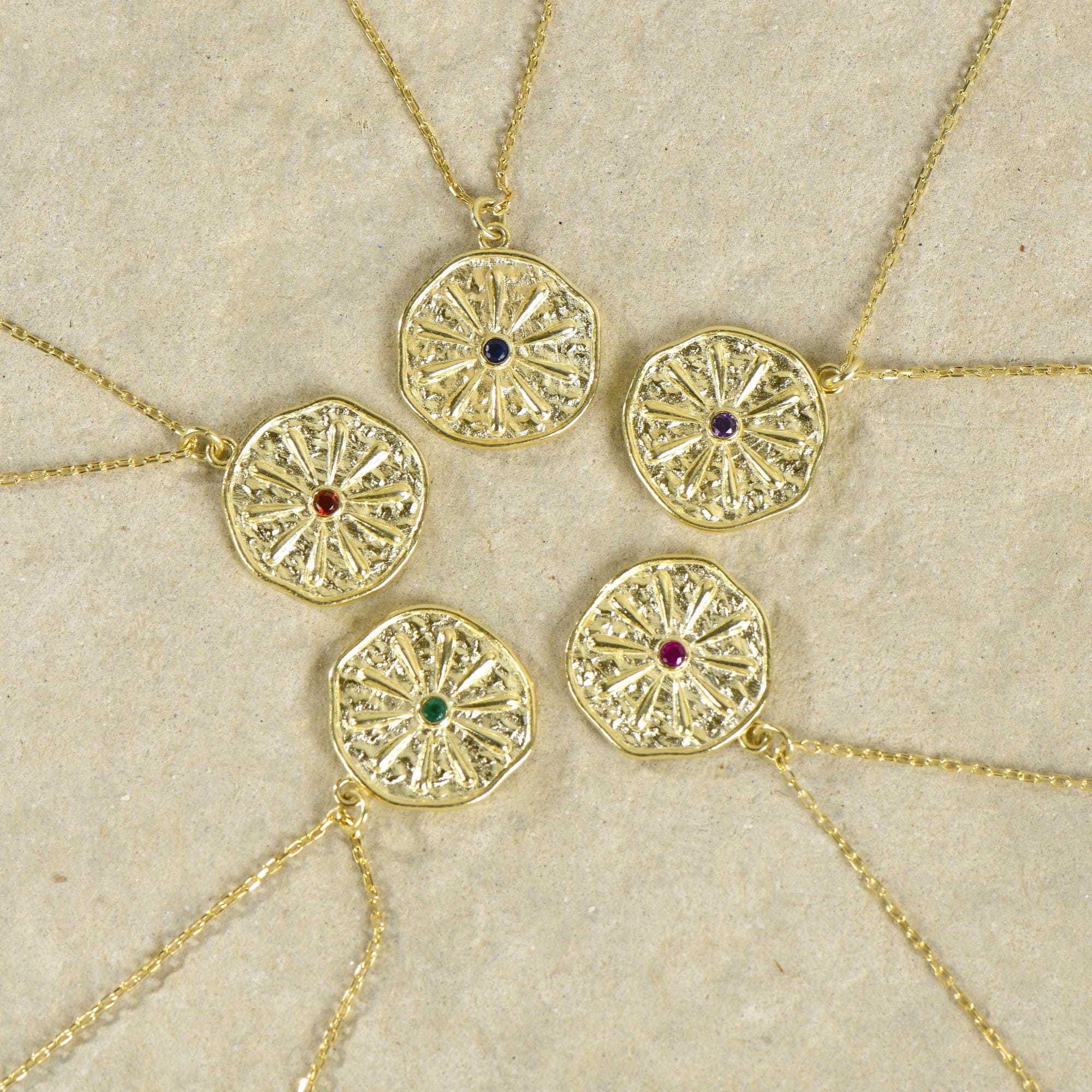 Silver Sumerian Sun Necklace with Birthstone, 24K Gold Plated Ancient Sun Pendant, Vintage Mesopotamian Medallion, Antique Jewelry For Women